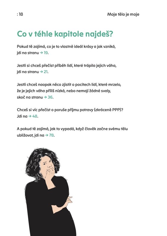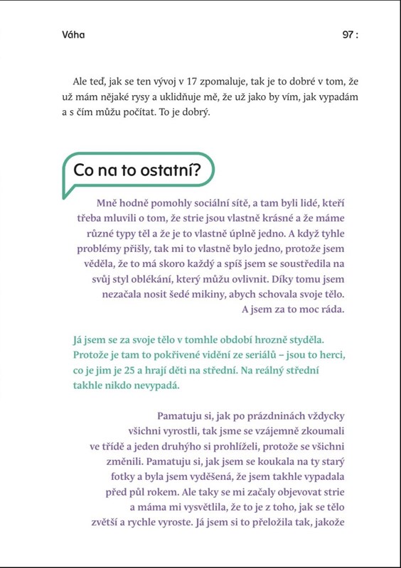 Každý den se díváš do zrcadla. Někdy je to v pohodě, ale někdy těžší. Tvoje tělo se mění, hlava jede naplno a svět okolo to často komentuje. Ale co když se chceš prostě cítit dobře? V téhle knize se setkáš s reálnými teens a mladými lidmi, kteří otevřeně mluví třeba o akné, nadváze, odlišnostech, nejistotách i o tom, co jim pomáhá, aby se jim lépe žilo v jejich těle.