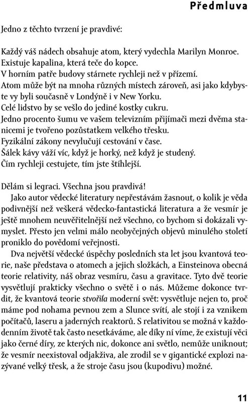 „Poté, co jsem přečetl nespočet knih, které údajně vysvětlují kvantovou teorii a teorii relativity i naprostým laikům, a nebyl jsem z nich příliš moudrý, jsem se rozhodl, že to přece musí jít i jinak – a napsal jsem tuto knihu,“ tvrdí autor. Po Vesmíru hned vedle (2003) a Čarodějné peci (2005) se tak českým čtenářům se dostává do rukou již třetí kniha Marcuse Chowna, známého popularizátora kosmologie a v současné době odborného poradce časopisu New Scientist. Chcete pochopit základní principy vesmíru, v němž žijeme? Chcete se dozvědět, jak je možné, že se celé lidstvo vejde do jediné kostky cukru? Proč každé vaše nadechnutí obsahuje atom, který vydechla Marilyn Monroe? Proč v nejvyšším patře budovy stárnete rychleji než v přízemí? Kvantová teorie, obecná i specifická teorie relativity, velký třesk, pravděpodobnostní vlny, kvantová „zapletenost“... To vše, slovy Jiřího Grygara, v podání „autora s mimořádným smyslem pro paradoxy a provokace všeho druhu (...), který umí čtenáře doslova přikovat ke svému textu.“