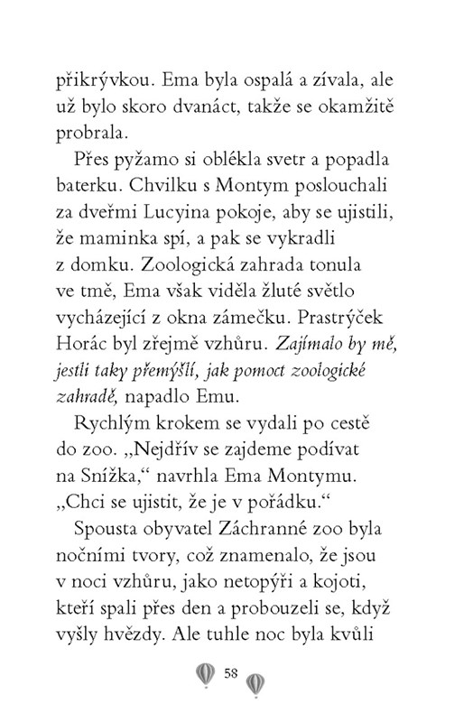 Emin strýček Horác tentokrát přivezl ze svých cest tulení mládě. Přes den se chová normálně, ale jakmile padne tma, začne být vystrašené. Co se mu asi stalo? Ema věří, že mu dokáže pomoct a strachu ze tmy ho zbavit. Bude však na to mít dostatek času? Zoologická zahrada má finanční potíže a hrozí, že ji zavřou!