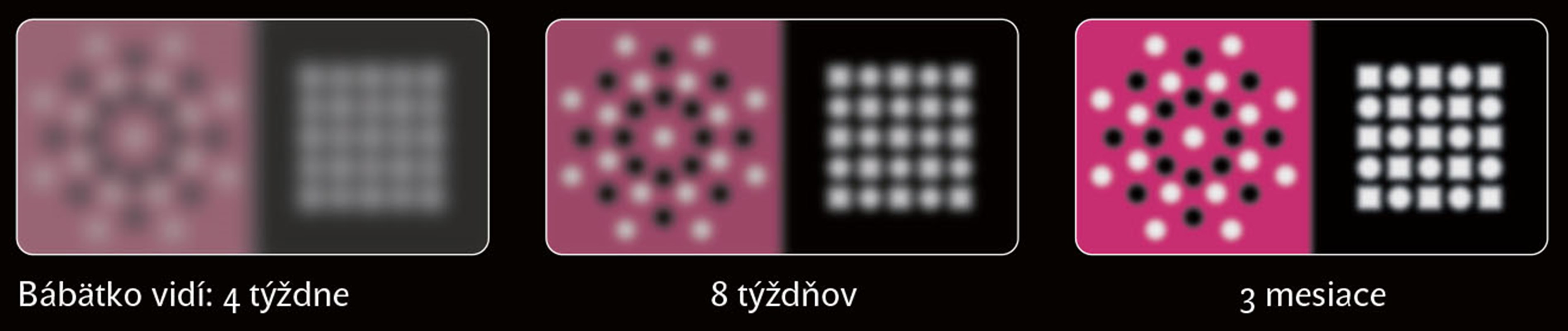 Bezprostredne po narodenĂ vidĂ bábätko len do 20 – 30 cm, teda do vzdialenosti tváre matky pri kĹ•menĂ. Jeho obraz je rozmazanĂ˝ a rozozná ÄŤiernu a bielu vo veÄľkĂ˝ch kontrastoch. NeskĂ´r vnĂma ÄŤervenĂş farbu a asi v 3-4 mesiacoch ĹľltĂş, modrĂş a zelenĂş. AĹľ v 6 mesiacoch dieĹĄa rozlĂši detaily a po dovŕšenĂ prvĂ©ho roku vidĂ ako dospelĂ˝. UkazovanĂm vhodnĂ˝ch obrázkov dieĹĄatku stimulujete nielen zrak, ale aj nervovĂş sĂşstavu a napomáhate jeho správnemu vĂ˝voju.
