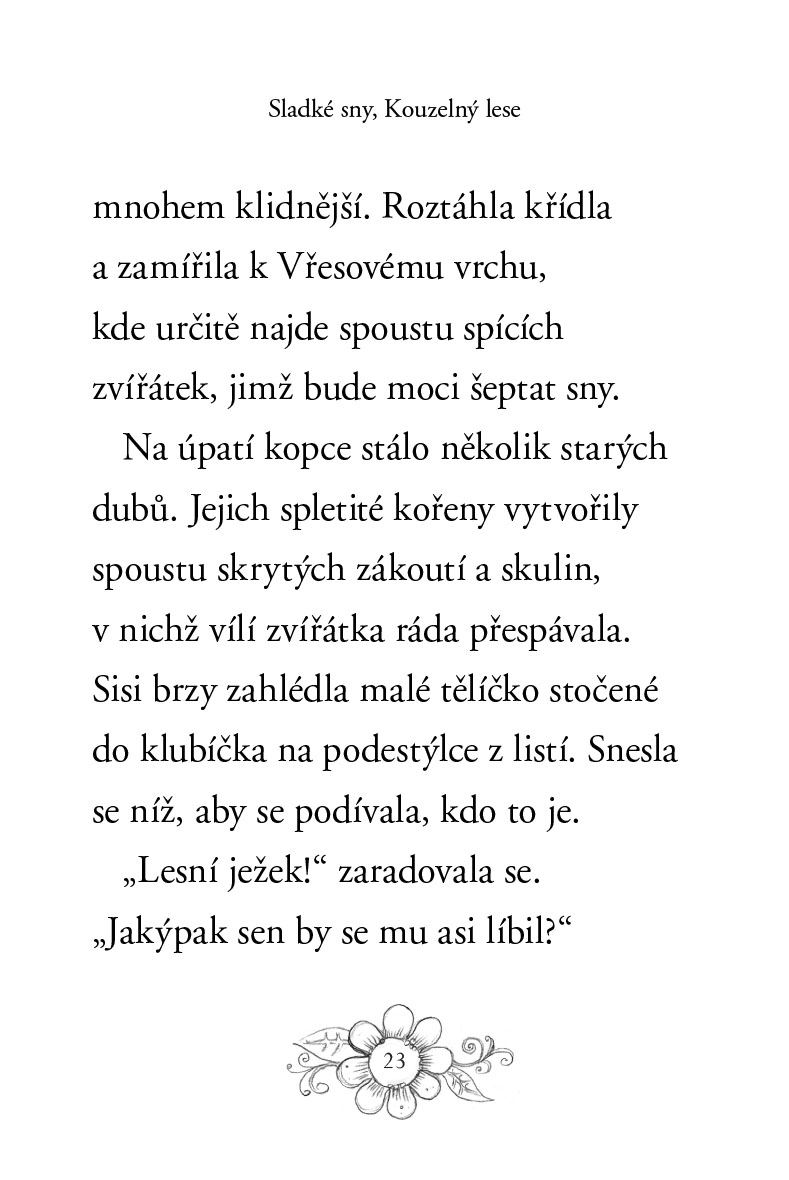 Srnečka Sisi miluje létání v měsíčním světle. Poletuje nad hlavami spících vílích zvířátek a šeptá jim do uší sladké sny. Jednou v noci potká malého ježečka, který se bojí usnout. Dokáže ho Sisi přesvědčit, že v Kouzelném lese se není čeho bát?