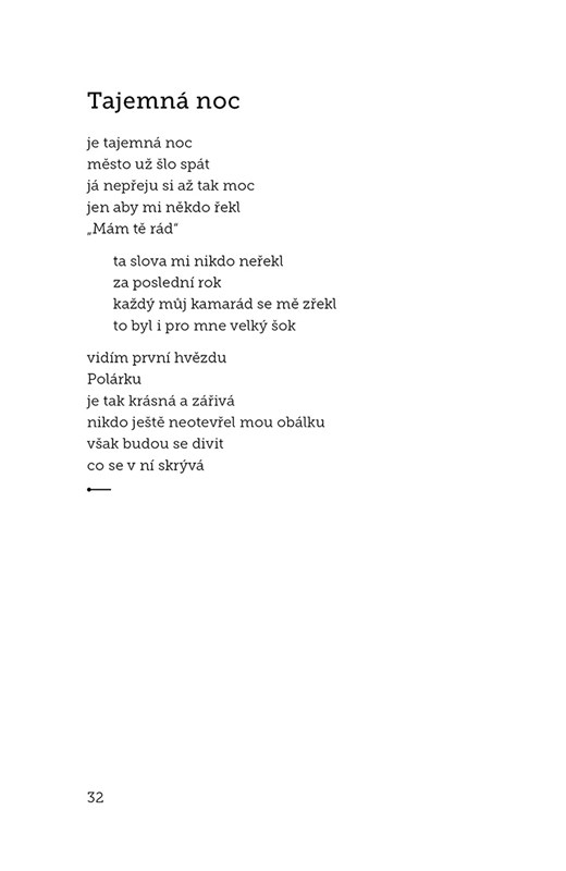 Tato sbírka básní je o temných dobách se světlými chvilkami a o naději v lepší zítřky. O emocích, které prožívá více a více lidí. O pocitech jako osamění, smutek, prázdnota, deprese, úzkost, sebevražedné myšlenky nebo existenční krize, které zažil snad každý a je důležité o nich mluvit.