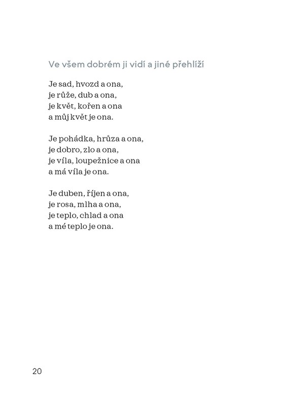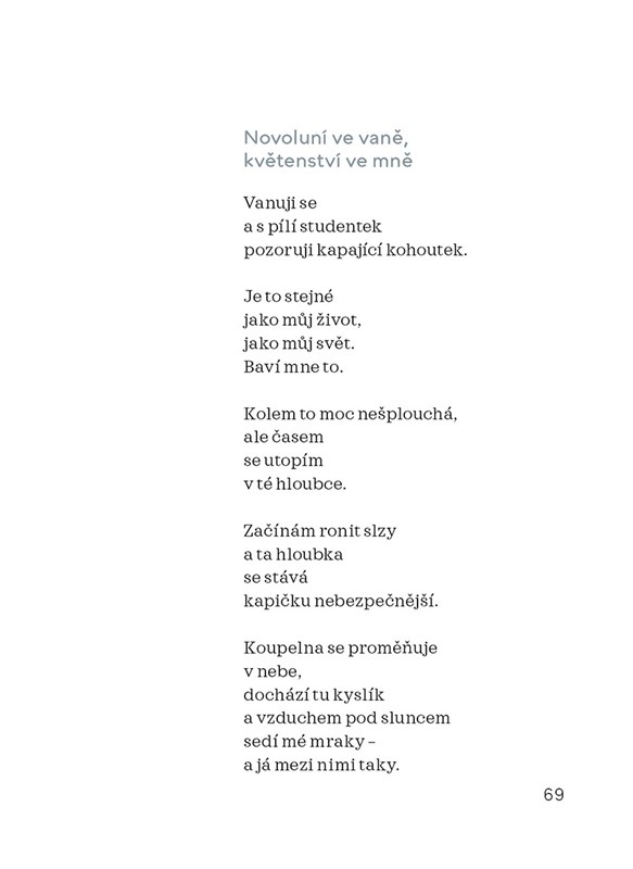 Malbami ilustrovaná sbírka lyrických básní různých forem o autorových niterních prožitcích, milostných tématech i temných myšlenkách a strastech. Psaná rozkvetlým jazykem.