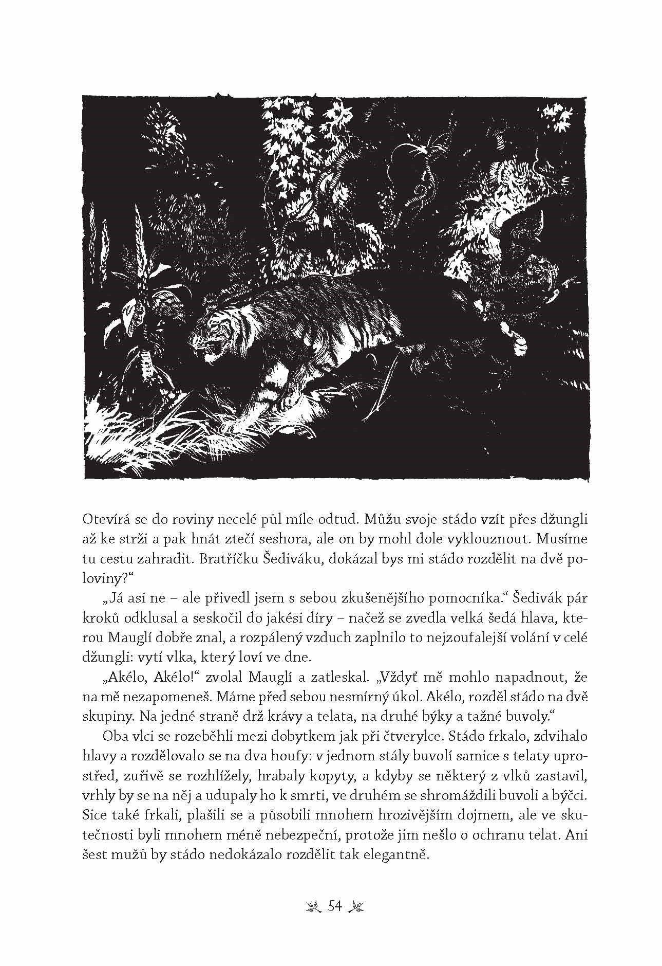 V jednotlivých příbězích se seznámíte s vlkem Akélou a jeho vlčí smečkou, dozvíte se, jaké přátelské ochrany se chlapci dostalo od medvěda Bálúa, jak Mauglího unesly opice, zachránil had Ká a jak nakonec zvítězil nad tygrem Šér Chánem. Příběhy, v nichž se mísí fantazie, magie i přesná pozorování stále působí hlubokým dojmem. Džungle v nich ožívá všemi pachy, nočními zvuky i skřeky exotických zvířat. Přežije v ní jen ten, kdo zná Balúova ponaučení a zákon džungle.