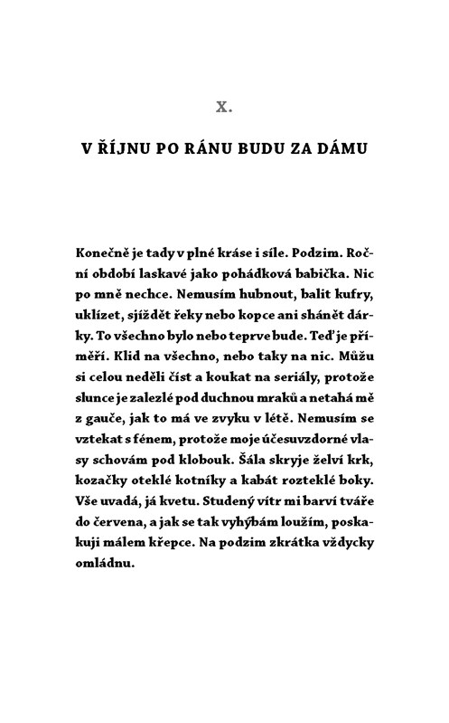 Jsem hezká, ale ne Barbie, jsem chytrá, ale ne intelektuálka, jsem vtipná, ale ne za každou cenu. Takovou ženu by chtěl každý muž. Než však k této dokonalosti žena dozraje, stihnou se jí zpravidla kromě obzorů rozšířit i boky a kromě životních zkušeností prohloubit vrásky. Tak co je vlastně nejdůležitější? Přece nadhled, humor a zážitky. A o tom tahle knížka je. Potkáte se v ní s ženou bez make-upu, bez iluzí, bez krajek. Zato opravdovou a především velmi, velmi důvtipnou.