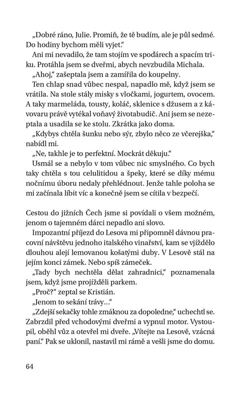 Debutový román Lucie Pilátové je detektivka, drama i romantická komedie v jednom pěkně utajeném rodinném balení. Když čtyřicátnice Julie nečekaně zdědí nemalé majetky v Rakousku a hlavně zámeček s vinným sklípkem v jižních Čechách, připadá si na princeznu už kapku za zenitem. Ve stávající rozvodové situaci s nevěrným manželem nemá na druhou stranu ke kapce kvalitního alkoholu daleko ani trochu. Cestou za rozuzlením spletitého rodinného tajemství nachází nejen sama sebe, ale nalézá i svou cestu k druhým.
