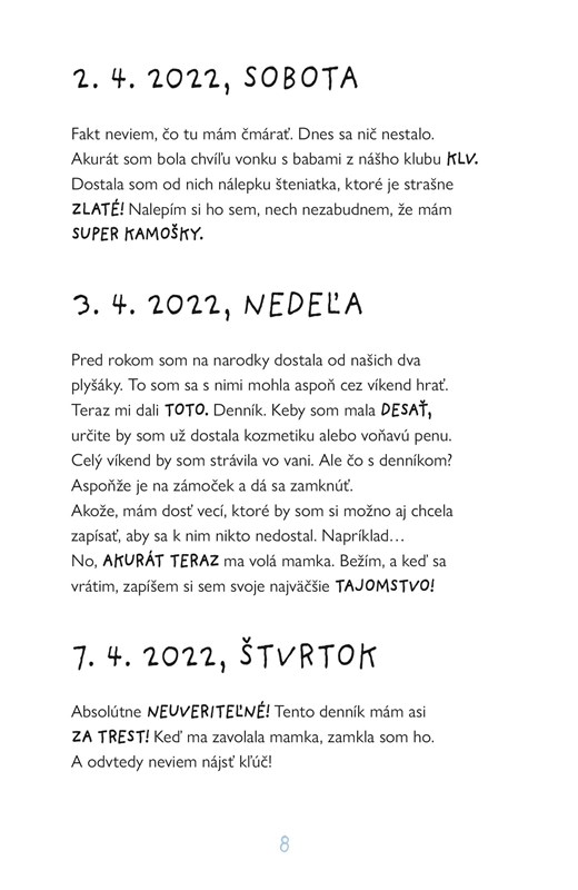 A denník je zrazu plný VZRUŠUJÚCICH dobrodružstiev a prekvapení – ako to bolo s klubom najlepších kamošiek, kto hnusne šikanoval Sáru, prečo Bobino skončil u Olivera, aké tajomstvo skrýva brat Majo a čo polícia odhalila v škole. Bolo to ŠO-KU-JÚ-CE!