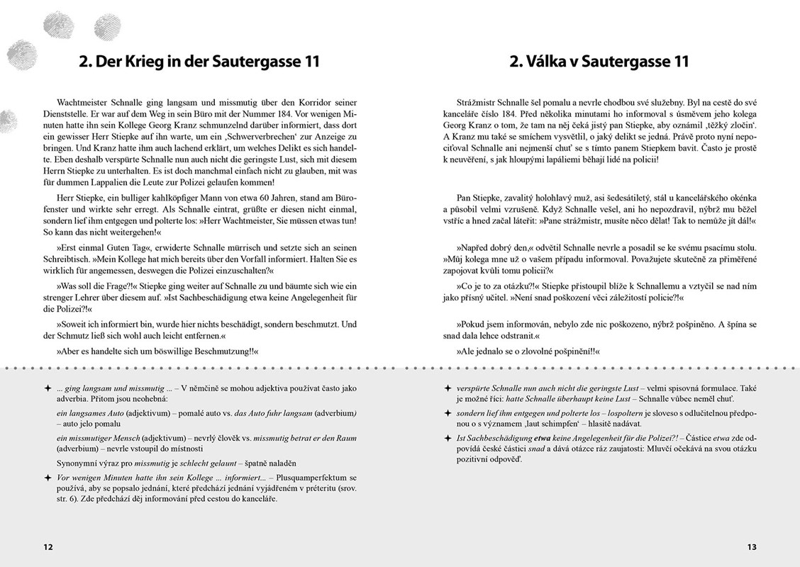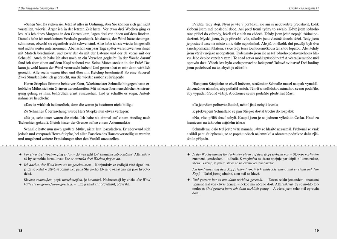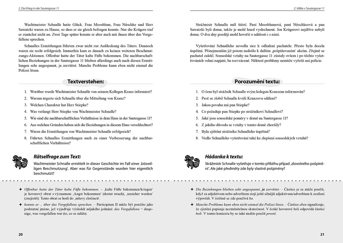 Pokud byste měli potíže s rozluštěním případů, napoví vám odpovědi k jednotlivým hádankám umístěné na konci knihy. Navíc v závěru naleznete také vysvětlivky k německé výslovnosti, které vám ji pomohou lépe zvládnout.