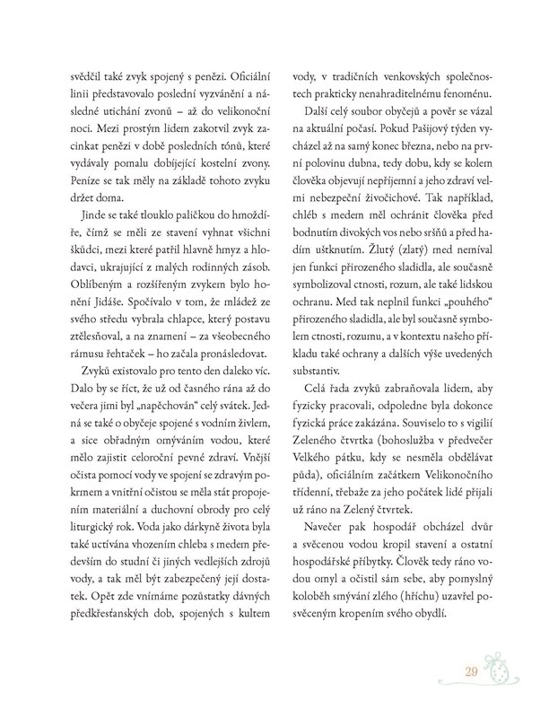 V církevním liturgickém roce jsou Velikonoce svátky největší¬mi, svou přítomností na bohoslužbách si je takto připomíná znač¬ná část české populace. Všichni je ale vítáme jako symbol přichá¬zejícího jara, protože přinášejí zvěst o očišťující životodárné síle člověka i přírody. Obsahují všechny barvy lidské duše – od smutku a rozjímání až po bujaré veselí. Ze života našich předků nás může inspirovat i očista organismu (malý půst), trend nového životního stylu, patrný zejména ve městech, kde je životní cyklus člověka stá¬le méně závislý na cyklu ročních období a přírody.