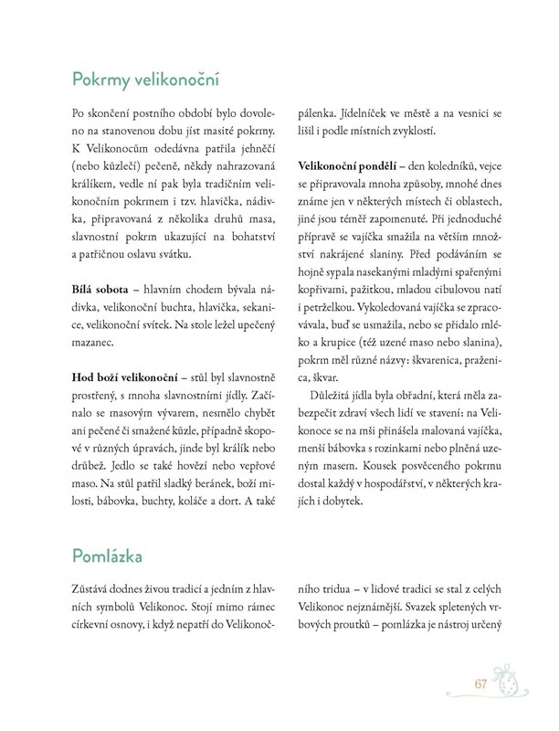 Kniha si neklade za cíl přinést kompletní teologický obraz vý¬znamu Velikonoc, chce zachytit alespoň některé zvyky a obřady, i jejich náboženské kořeny, připomenout nejen naše tradice, ale i ty ve světě, inspirovat k velikonoční výzdobě interiéru a pro postní i slavnostní jídelníček předložit mnoho nejrůznějších receptů s po¬drobným popisem přípravy.