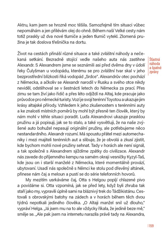 Tady její vyprávění pokračuje. Nasedněte spolu s ní a jejím parťákem Luďou do jejich terénní Toyoty Land Cruiser a nahlédněte do světa kočovných pastevců v Kyrgyzstánu, objevujte neuvěřitelné divy přírody východního Kazachstánu a nechte se okouzlit divokou krajinou Sibiře. Čekají vás svérázná setkání s místními lidmi, dobrodružná jízda k ledovci v ruském Altaji a také spousty dlouhých večerů u praskajícího ohně. Zažijete atmosféru dálek, absolutní volnost, a hlavně okusíte, jaké je to žít na cestě.