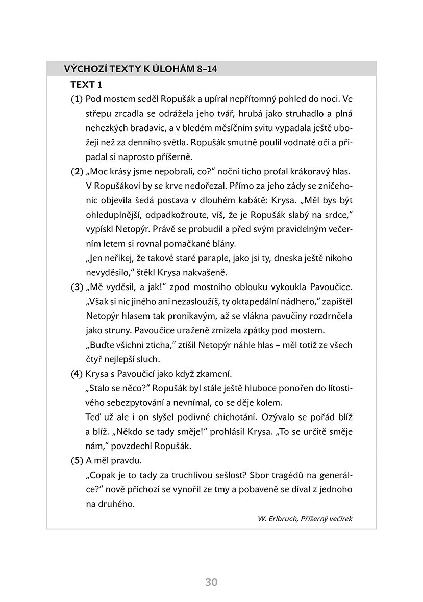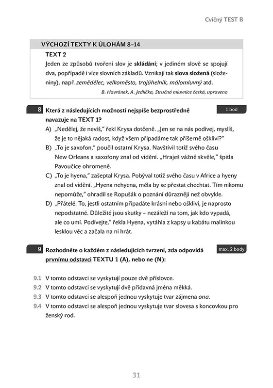 Publikace obsahuje 11 cvičných testů z českého jazyka a literatury. Jsou sestaveny tak, aby žáci získali ucelenou představu o tom, jak jsou otázky formálně koncipovány a uměli se v nich dobře orientovat. Naučí se pracovat s jednotlivými typy úloh a budou si moci vyzkoušet, jak by v testu uspěli. Vyhodnocení správných odpovědí naleznou v klíči správných řešení.