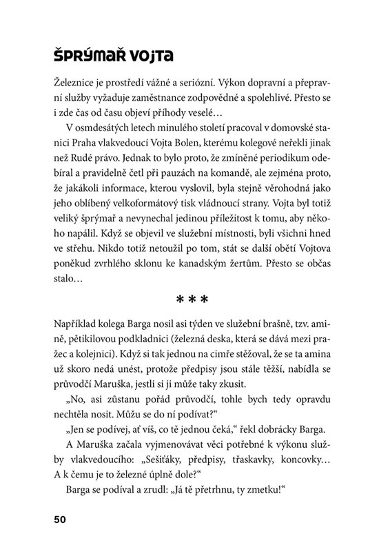 Pořád se něco děje, a na železnici zvlášť! Příběhy a povídky, podané s lehkou nadsázkou, vycházejí ze skutečných událostí, které se na dráze přihodily. Nezáleží na tom, zda jste vlakvedoucí, závorář, výpravčí či strojvůdce – všude tam, kde se lidé setkávají s technikou není nouze o zajímavé situace. Možná v nich poznáte někoho blízkého, nebo dokonce sami sebe. Přesto věřte, že jakákoli podobnost je čistě náhodná. Jednu věc však mají všechny příběhy společnou. Humor. Humor, který železničáře neopouští ani v těch nejtěžších chvílích.