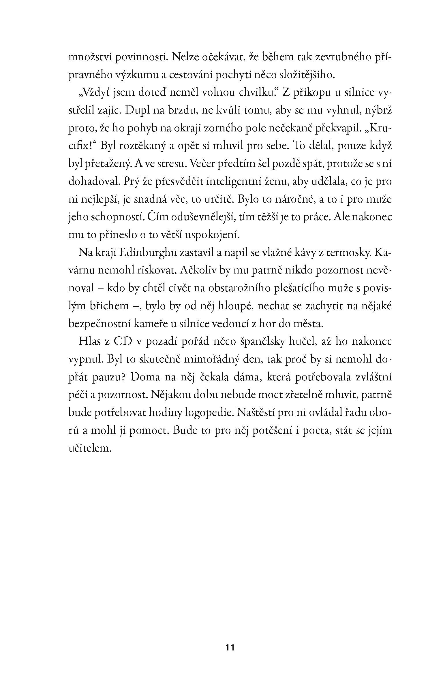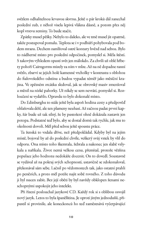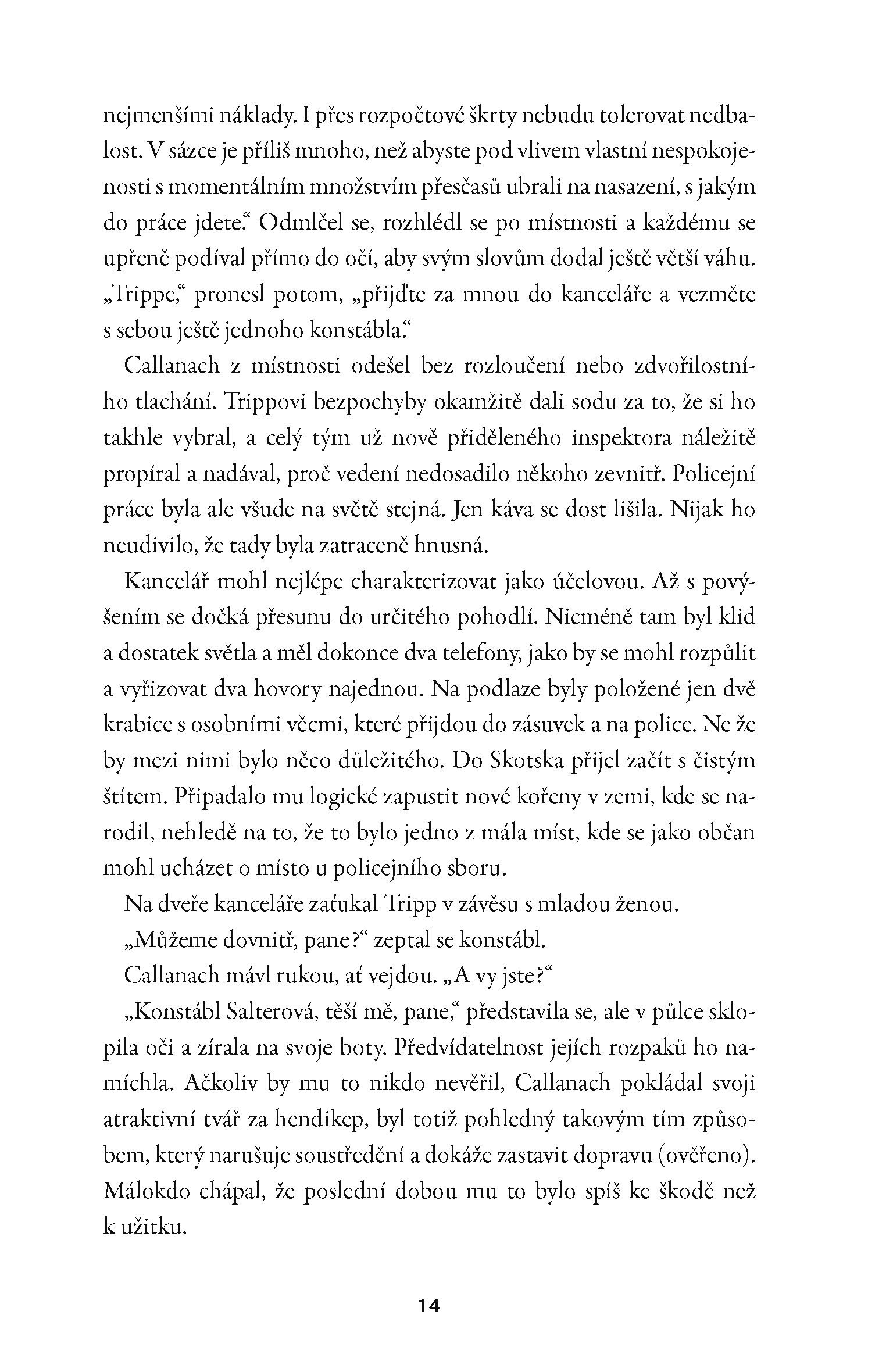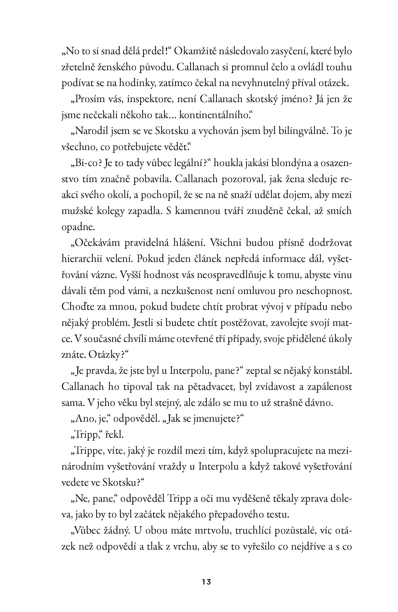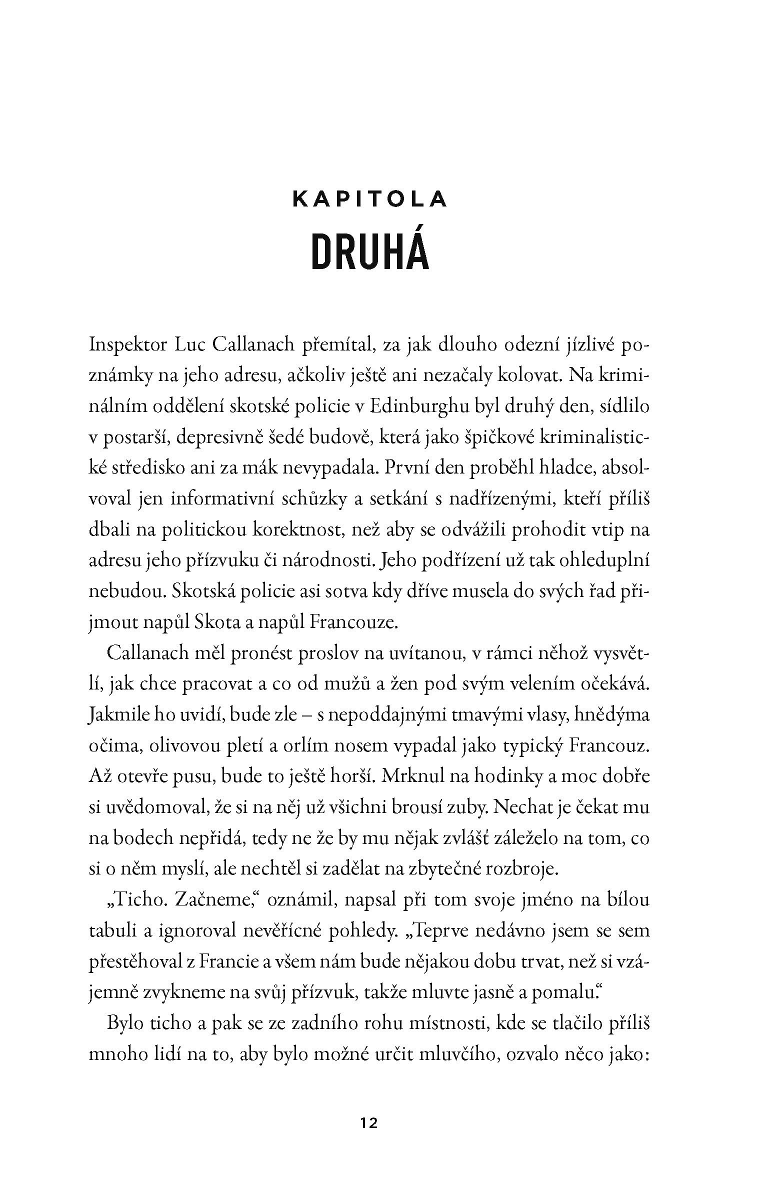 V odlehlém koutě Skotské vysočiny shořelo tělo Elaine Buxtonové. Jediné, podle čeho může policie pohřešovanou právničku identifikovat, je zub a cár zkrvaveného šátku. V tajné místnosti kdesi v Edinburghu mezitím skutečná Elaine Buxtonová vyděšeně křičí do tmy. Inspektor Luc Callanach opustil slibnou kariéru u Interpolu a začíná od nuly. Obstojí před novými kolegy i ve střetu s vrahem, který za sebou pečlivě zahlazuje všechny stopy? Rafinovaná zápletka, která vás chytí od první stránky, sympatická dvojice vyšetřovatelů, kterou vedle „krasavce Luca“ tvoří svéhlavá a přívětivá Ava Turnerová, a opravdu odporný zločinec, to jsou přísady, díky nimž si tuhle knihu vychutná každý fanoušek detektivního žánru. Přeložila Nela Knapová.