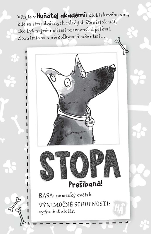 Šteniatko Stopa sa chce stať policajným psom. Spolu s ostatnými kamarátmi chodí do Huňatej akadémie, kde sa učia všetko potrebné. Teraz sa šteniatka snažia získať Odznak pomoci, aby mohli pomáhať ľuďom. Stopa na skúšky mešká a pri strážení skladu jej niekto spod nosa ukradne dobroty určené všetkým psom.