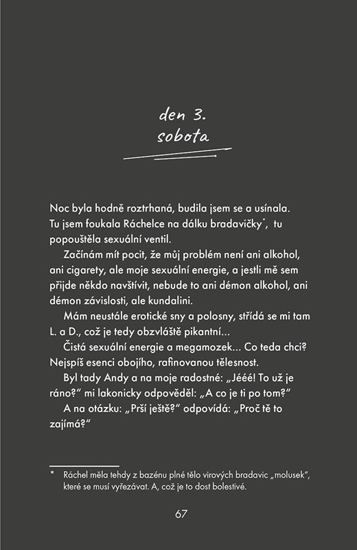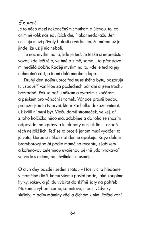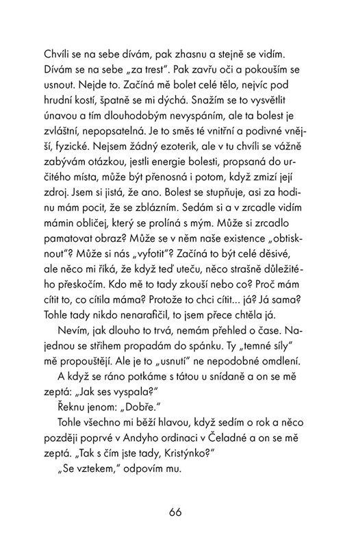 Bez cenzury, poutavě, svižně, dramaticky a s humorem, který miluju od našeho prvního setkání. Taková je Kristýna, tak i píše. Kniha mě vcucla a vyplivla řádně emočně vyšťavenou až s poslední stránkou. Je to skvělá jízda různými dimenzemi, která mi učarovala formou i obsahem. Přestože jsem s nadsázkou ráda pošťuchovala, že bych se radši vydala na týden k moři nebo na hory, než se nechat zavřít do temné boudy, začíná mě svědit myšlenka, že je mnohem větší dobrodružství najít to moře a slunce a hlavně klid v sobě. Musí to být skvělé, musí to být těžké, mám pocit, že mě to jen tak neobejde. Děkuju, Týnko.