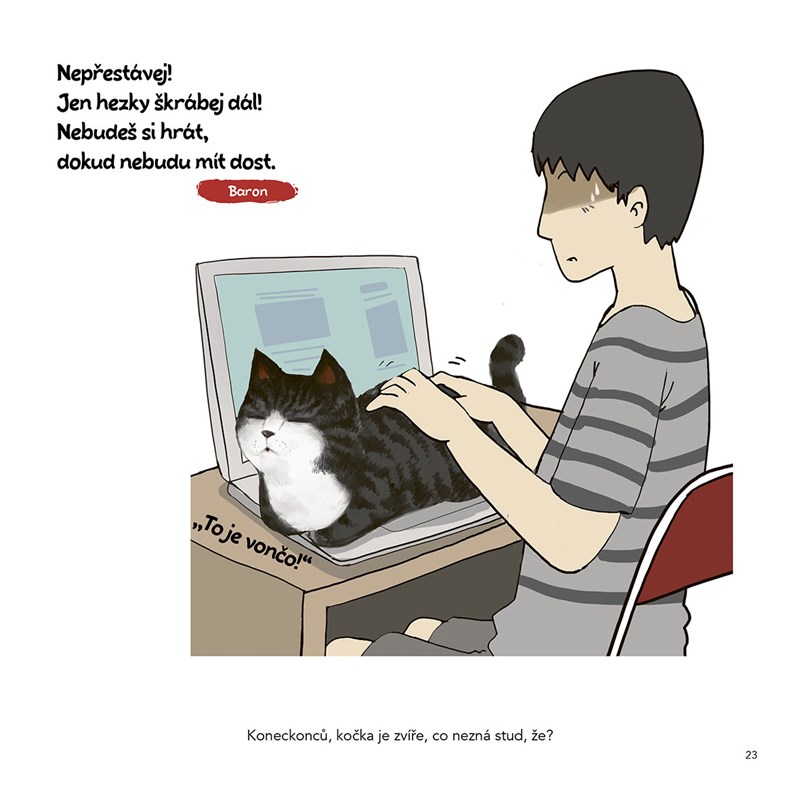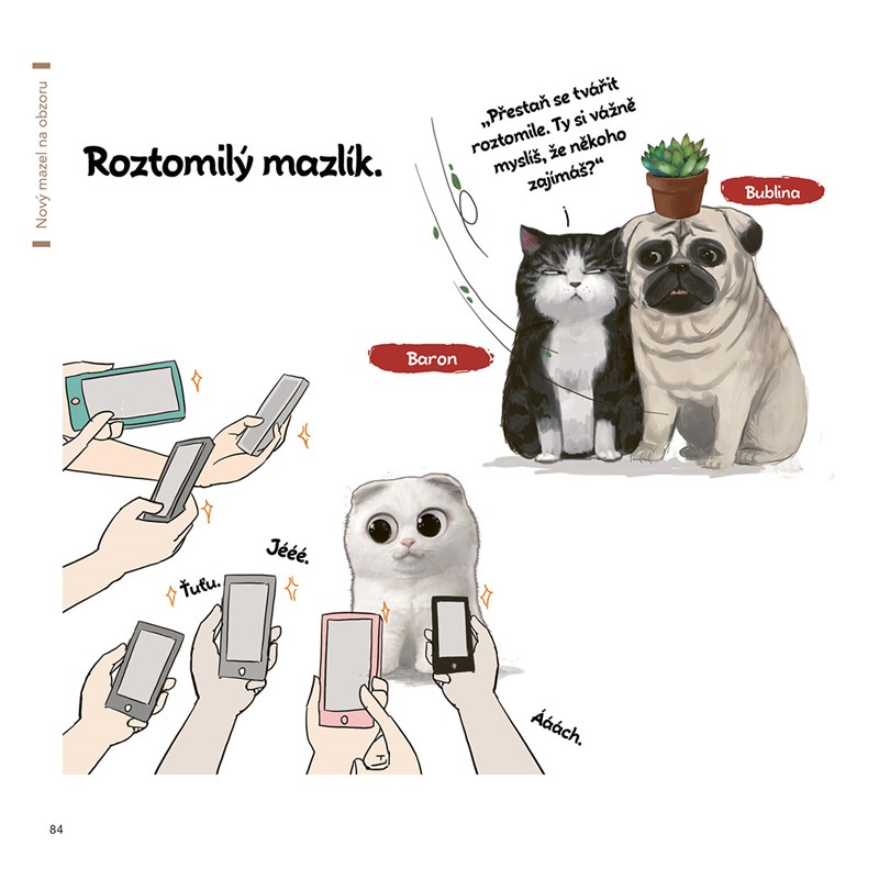 Ilustrátor této knížky si žil svůj klidný a nudný život, dokud mu do života nevstoupil původně toulavý kocour Baron a mops Bublina. Baron je správná kočka – všechno ví nejlíp, myslí si, že mu všichni musejí sloužit, a nebojí se to dávat patřičně najevo. Bublina je naproti tomu klasický mops – moc rozumu nepobral, ale dohání to svou roztomilostí a zápalem pro věc. Pobavte se s tímto komiksem jejich veselými příběhy i každodenními legráckami a zažijte, jaké to je, když se v jedné domácnosti potkají dva nevyzpytatelné živly – kocour a mops.