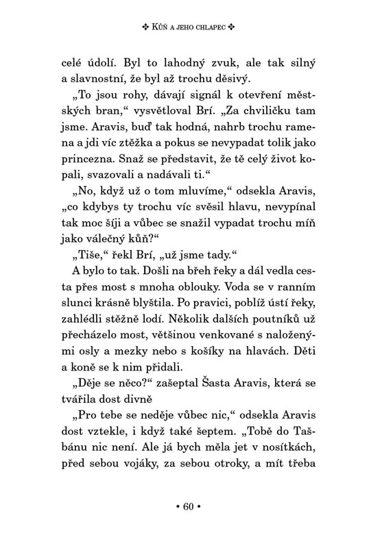 Je spousta dveří, ale pouze jedny vedou do jiného světa. Projděte s námi do země zázraků a kouzel - do Narnie! Vydejte se společně s malým chlapcem Šastou a jeho mluvícím koněm na cestu plnou záhad, nebezpečí, intrik a strachu. Podaří se Šastovi najít vytouženou Narnii a rozluštit záhadu vlastního původu? Dokáže odvrátit nebezpečí, které Narnii hrozí?