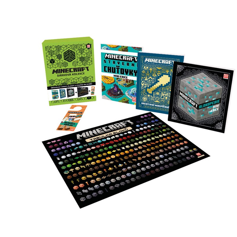 Uvnitř Dárkové kolekce najdete inspirativní užitečnou Kreativní příručku, knihu s geniálními Stavebními chuťovkami pro všechny stavitele a přehlednou Blokopedii! Součástí kolekce je atraktivní plakát s tabulkou plnou spousty minecraftových bloků a oboustranná visačka na dveře s perfektními vzkazy!