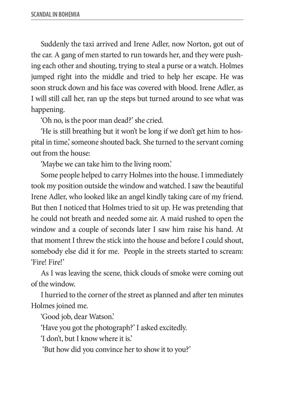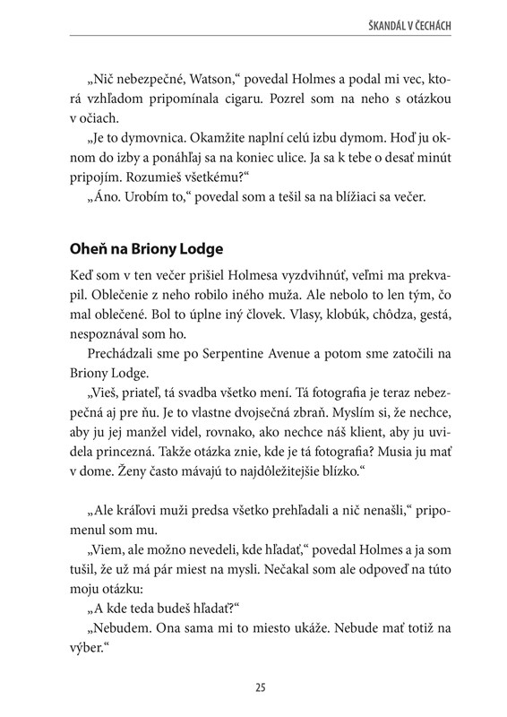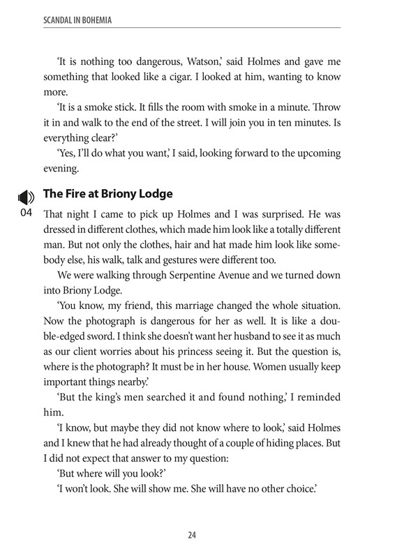 Publikácia ponúka štyri príbehy Sherlocka Holmesa, ktoré sú určené mierne pokročilým študentom angličtiny. Záujemcovia sa vďaka nim nielen zoznámia s prípadmi, v ktorých slávny detektív rozohráva svoje brilantné logické myslenie, ale tiež si precvičia angličtinu. Slovenský zrkadlový preklad umožní skontrolovať, či cudzojazyčnému textu správne porozumeli. Na konci knihy