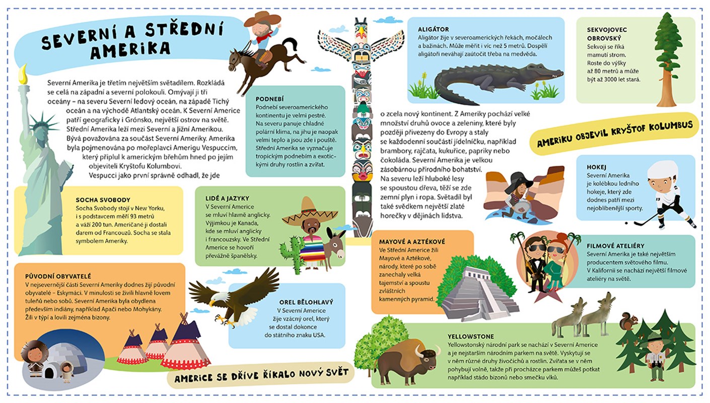 Atlas světa pro děti je určen všem malým cestovatelům, kteří se chtějí dozvědět spoustu zajímavých informací o planetě, na níž žijí. Každému kontinentu se věnuje zvláštní kapitola a především velká rozkládací mapa, na které je pomocí barevných ilustrací přehledně zobrazeno, co je pro daný kontinent nejtypičtější. Na čtenáře čeká velké množství informací o obyvatelích jednotlivých částí světa, o zvířatech, která zde žijí, o rostlinách, jež tu rostou, ale i o místní architektuře, lidových tradicích a kultuře vůbec.