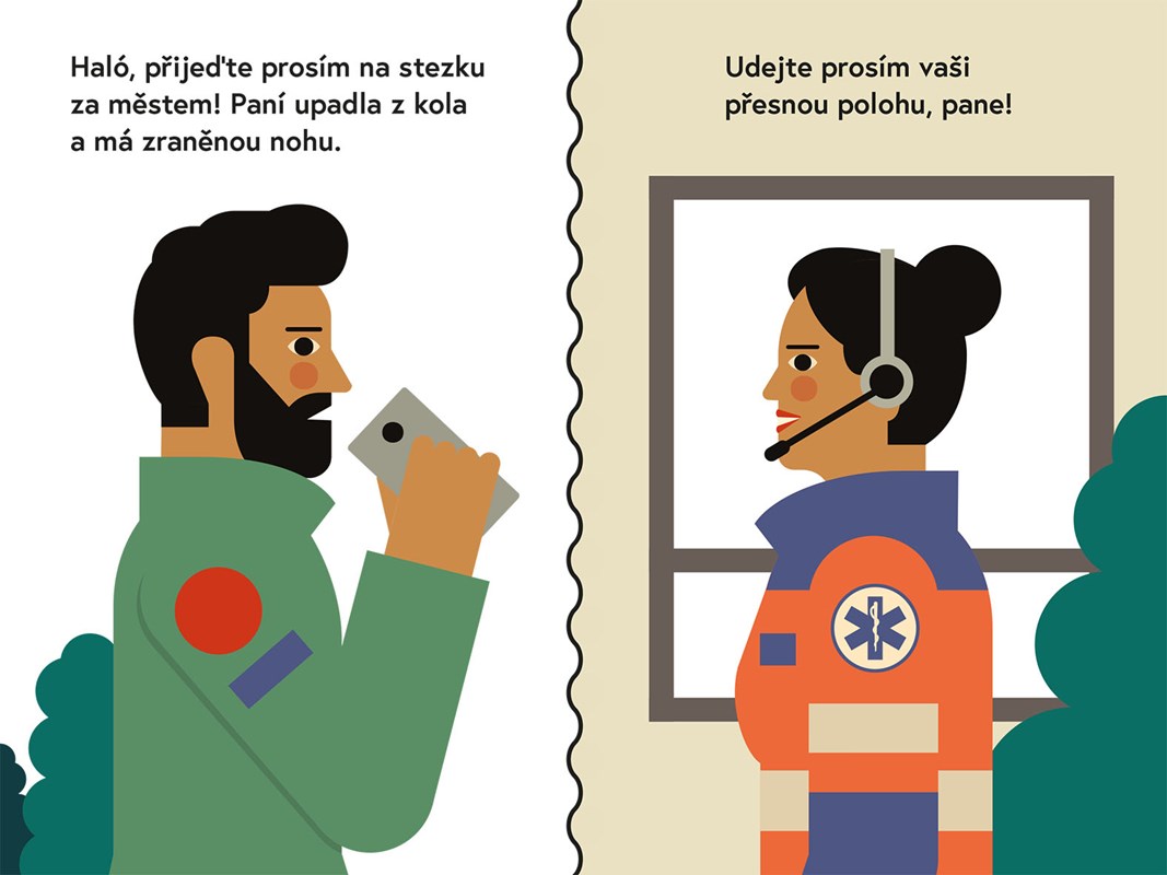 Haló, pomozte prosím, stal se úraz. Tom je na procházce s tatínkem a nezbedný pes Ben vběhne pod kola cyklistce. Tatínek zavolá pro zraněnou ženu záchranku, Tom zatím vyplísní Bena a pak společně sledují práci záchranářů. Nechtějí samozřejmě zdržovat, ale podaří se jim nahlédnout i do záchranářského auta, aby zjistili, co to uvnitř pípá.