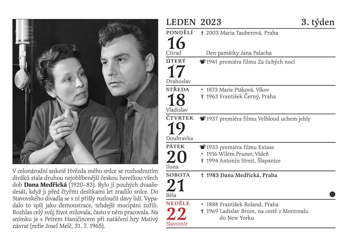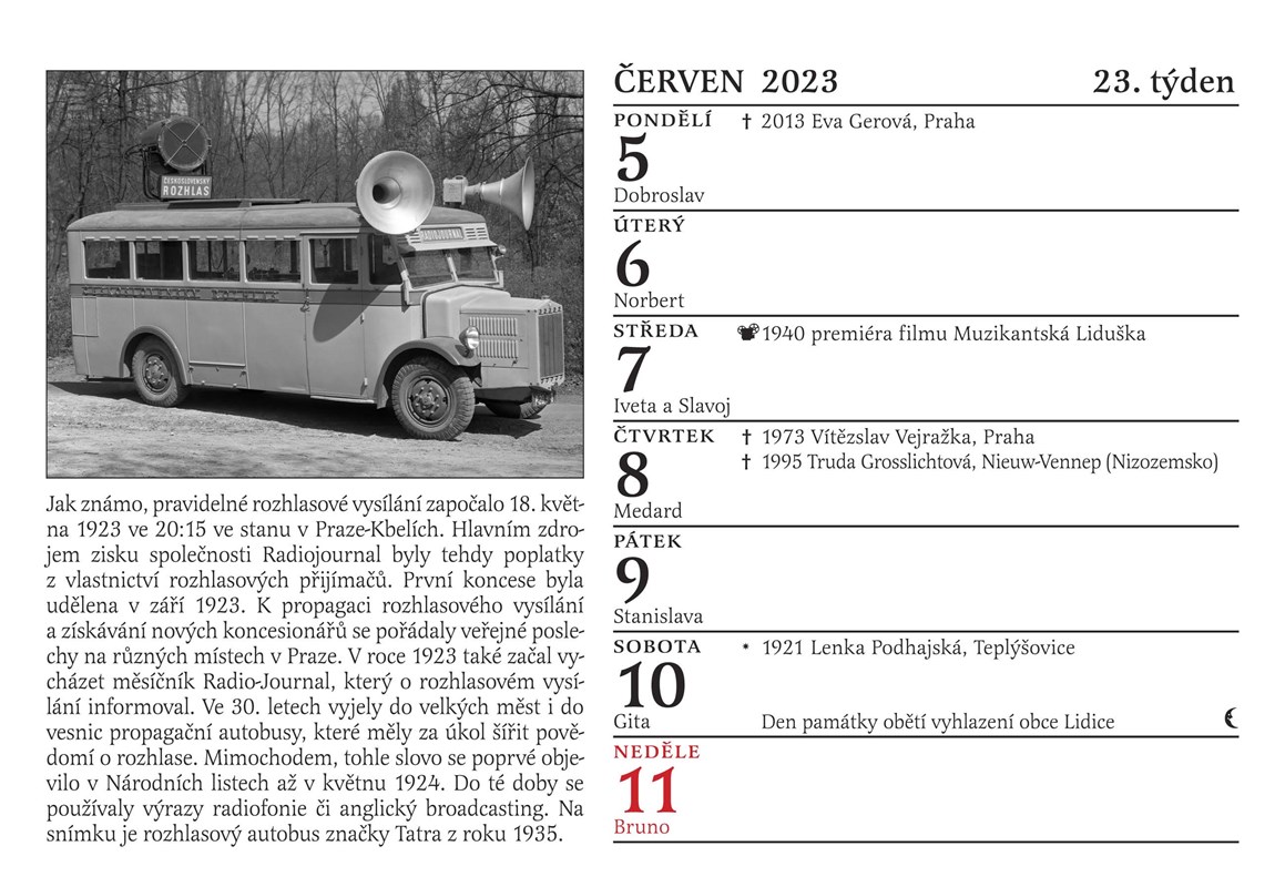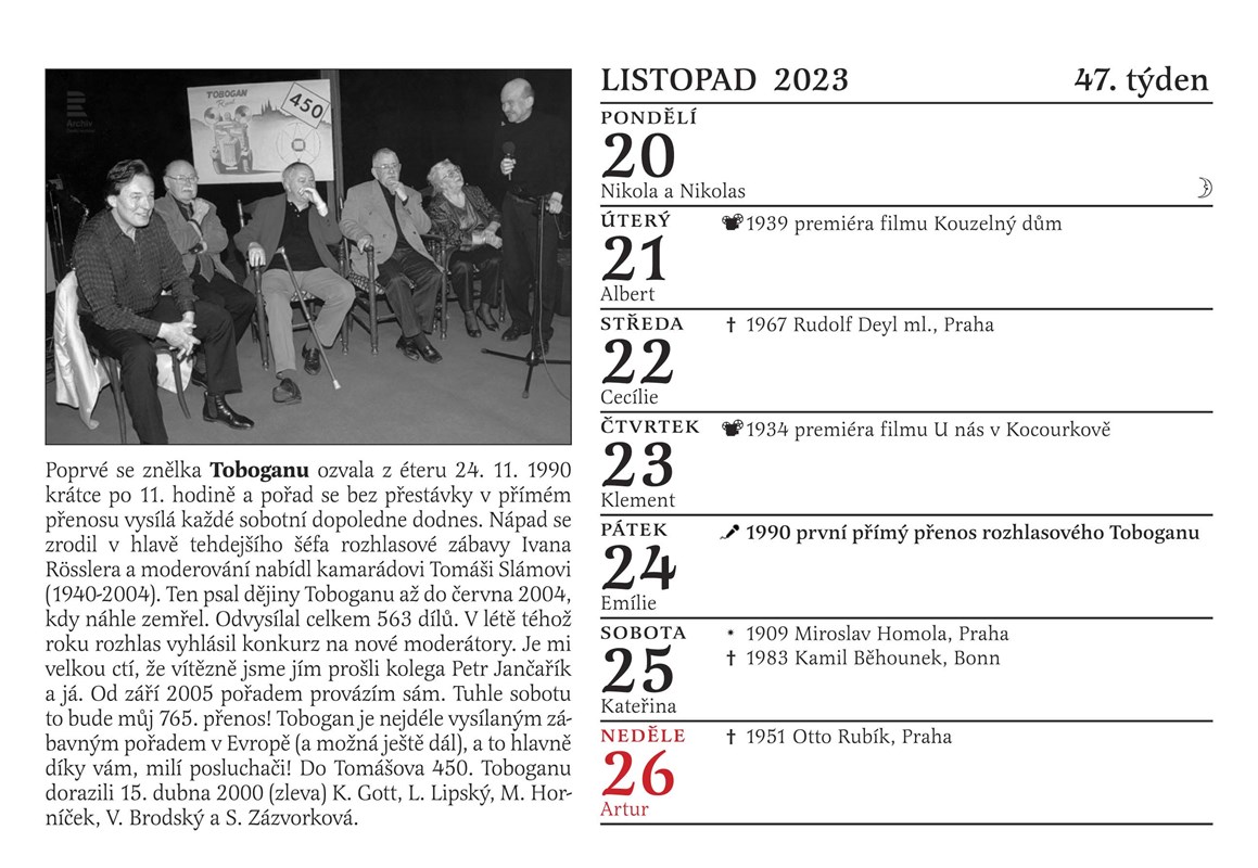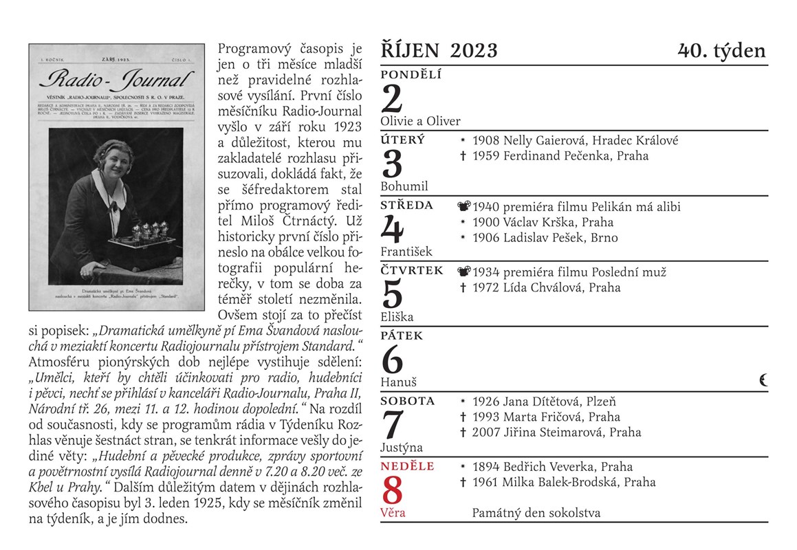 A ještě jedno překvapení: poslouchejte každou neděli mezi 14. a 16. hodinou na Českém rozhlase Dvojka Nedělní Kolotoč Michala Jagelky. Jeho součástí totiž bude po celý rok 2023 společné otáčení kalendáře. Nový týden jako by v éteru ožil, a to, co si na stránce kalendáře přečtete a prohlédnete, si ve vysílání rovnou i poslechnete! Jsme tedy prvním kalendářem v historii, kterým je možné nejen listovat, ale který si můžete i poslechnout. Jak by ne, vždyť rozhlas slaví narozeniny!