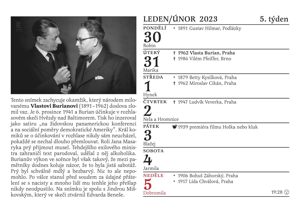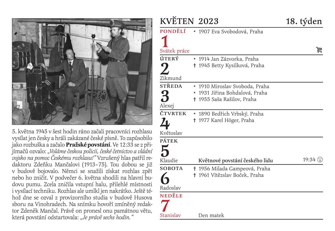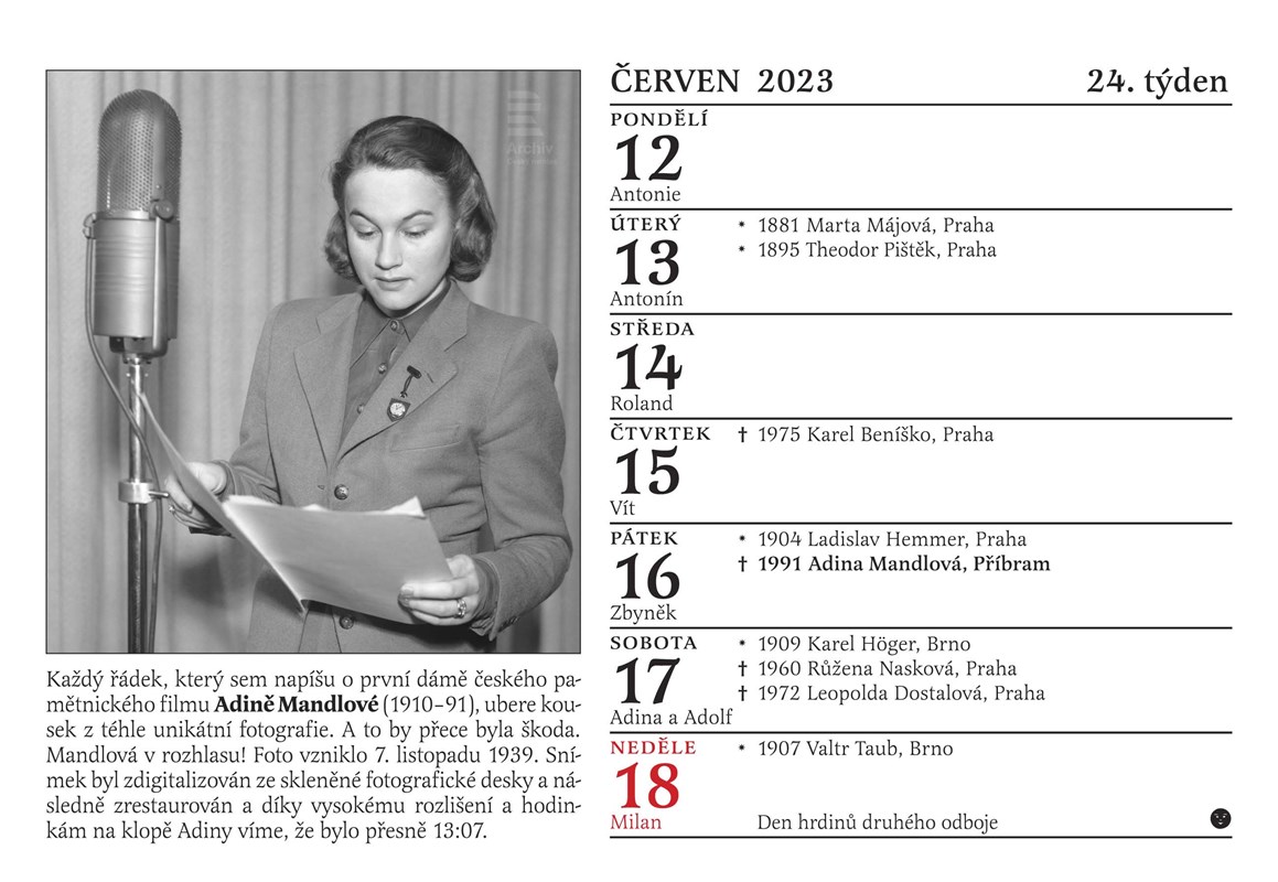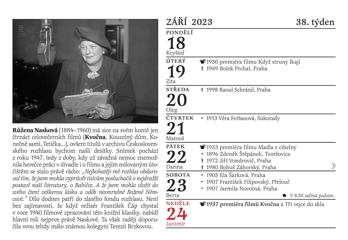 A ještě jedno překvapení: poslouchejte každou neděli mezi 14. a 16. hodinou na Českém rozhlase Dvojka Nedělní Kolotoč Michala Jagelky. Jeho součástí totiž bude po celý rok 2023 společné otáčení kalendáře. Nový týden jako by v éteru ožil, a to, co si na stránce kalendáře přečtete a prohlédnete, si ve vysílání rovnou i poslechnete! Jsme tedy prvním kalendářem v historii, kterým je možné nejen listovat, ale který si můžete i poslechnout. Jak by ne, vždyť rozhlas slaví narozeniny!