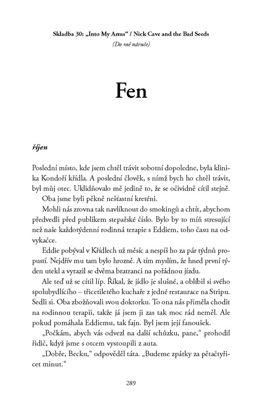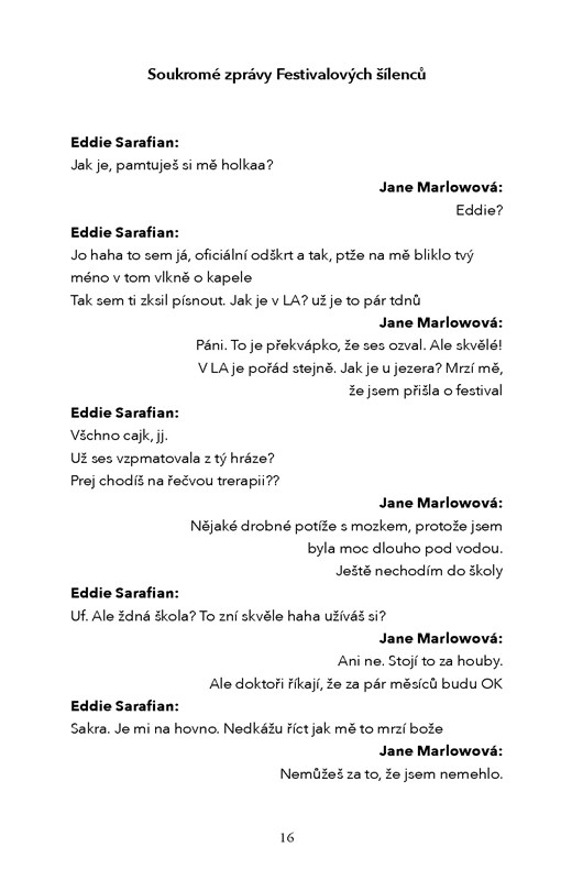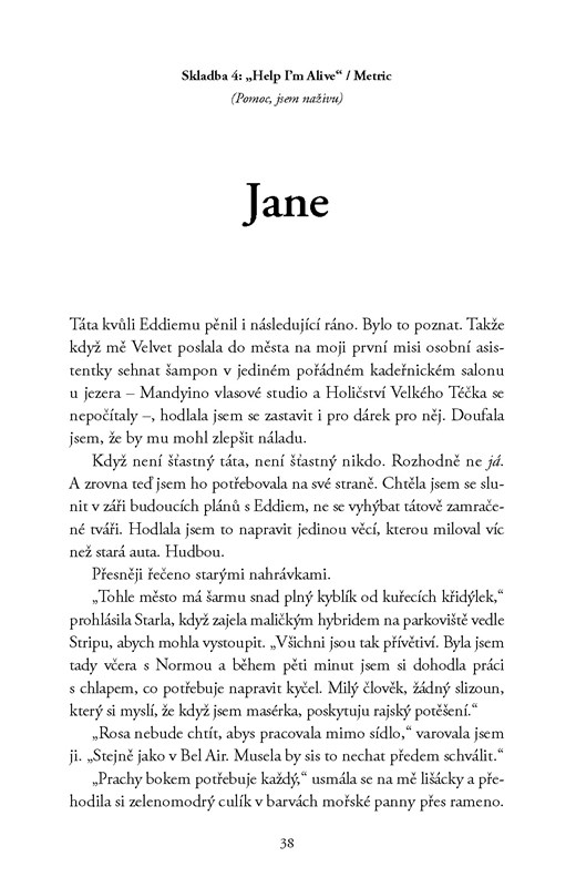 Ale když se vrátí k jezeru a tam se znovu setká s Eddieho tajuplným bratrem Fenem, začne o svých citech pochybovat. Fen Sarafian taky miluje hudbu – a nesnáší všechny ty tanečky kolem. Rodina ho vystěhovala a teď si vydělává v obchodě s deskami. Okamžitě pro Jane zahoří a udělal by cokoli, aby podrazil svého staršího bratra. I kdyby to znamenalo rozcupovat obrovský rodinný festival na kousky. A nebo Janino srdce.