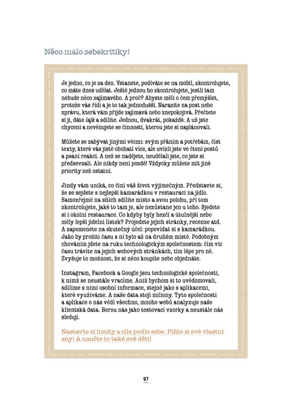 Sledovat svoje děti, špehovat je? Ignorovat veškerá rizika, která internet přináší? Nebo je naučit sebekontrole a zodpovědnosti? Ať už jste máma/táta (učitel/ka, dědeček či babička) nebo rozený digitální expert, je třeba přijmout fakt, že obrazovky a sociální sítě jsou v našem každodenním životě neustále přítomné. Ráda bych vás podpořila v tom, abyste ze své pozice dospělých, přijali závazek, že své děti na jejich digitální cestě doprovodíte. Díky tomu bude užívání sítí bezstarostnou pozitivní zkušeností, která vás spojí, místo aby vás od sebe oddalovala.