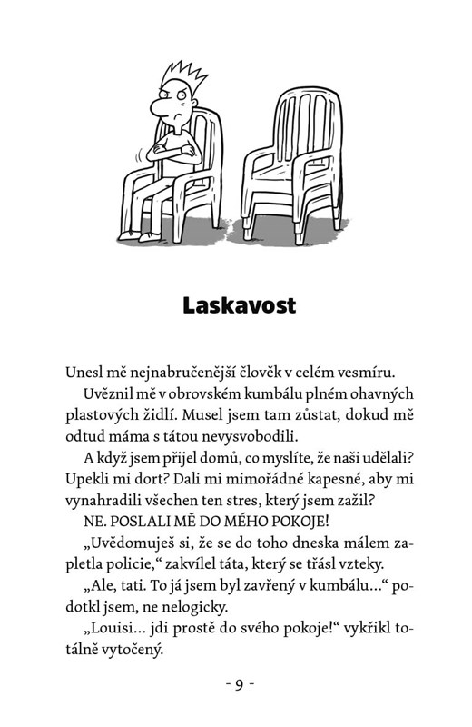 Můžou být Louisovi rodiče ještě trapnější? Budou někdy podporovat jeho sny? Proč všichni nosí blýskavé a špatně padnoucí oblečení? A proč proboha všichni skandují „ómmmm“? To se dozvíte v další knížce plné veselých (a smutných!) příhod školáka Louise, který se chce stát světoznámým komikem.