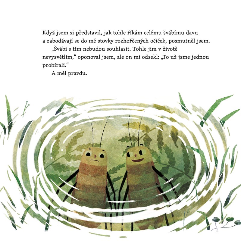 Lidé nesnáší šváby, to se ví. Nikdo ale netuší, co si švábi myslí o lidech. Dokážete si představit, jaké to je být broukem, kterého se všichni štítí? Co třeba takový švábí náčelník, který musí celý svůj zpohodlnělý švábí kmen zachránit před vyhubením a vydat se s ním na nejistou dobrodružnou cestu? A jak si s tím poradí introvertní švábina Gábina, která nejraději plete ponožtičky a z ostatních švábů panikaří? Pak jsou tu také švábátka se svou nekonečnou řadou zvídavých dotazů, přechytralá Křuska a tajemní švábi. A slyšeli jste vůbec někdy o mnohonožkách? Možná by vás zajímalo, kdo pro ně vůbec plete všechny ty mnohoponožky?