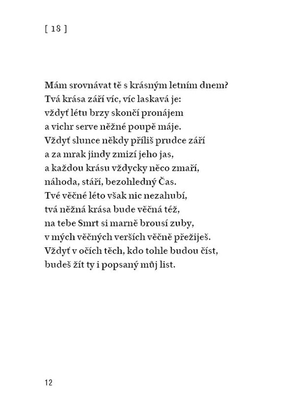 Shakespearovy Sonety v nejžádanějším překladu. Jak říká nejrenomovanější současný překladatel a znalec Shakespearova díla, prof. Martin Hilský, „každý ze Shakespearových sonetů lze chápat jako rozhovor či jako dopis ve verších, celou jeho sonetovou sbírku pak jako básnickou korespondenci. Žádné Velké Umění, v němž promlouvá Bard či Klasik. Spíš příležitostná poezie, dopisy pro všední den. Tak trochu sváteční Shakespearova pošta“. Shakespearovy Sonety jsou především knihou lásky, a možná právě proto vycházejí od roku 1609, kdy vyšly prvně, neustále, jak v originále, tak i v mnoha překladech. Výběr a doslov Martin Hilský.