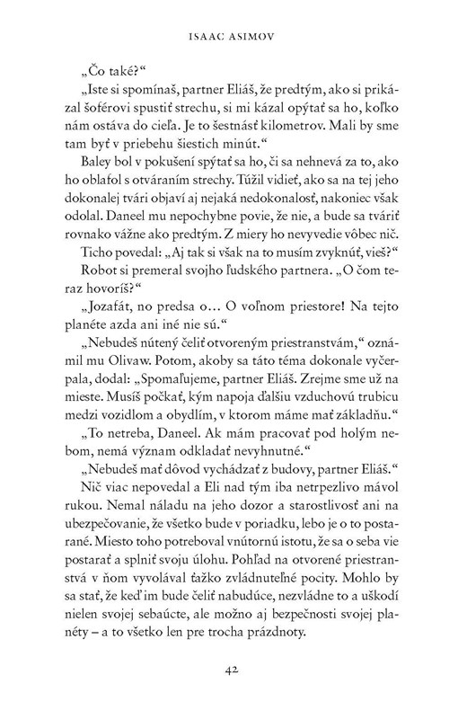 Autor pracuje so zaujímavou teóriou, ktorej by však dala aj dnešná veda za pravdu. Čím viac sa človek izoluje od ostatných, tým menej mu chýbajú, až napokon nie je schopný tolerovať blízko seba inú osobu. Na Solarii ľudia žijú stovky rokov, choroby neexistujú a vďaka takmer dokonalému poznaniu génov sa nerodia ľudia s postihnutím. Roboti tu vykonávajú všetko, ľudia nemusia pohnúť ani prstom, iba si užívať život. Asimov konečne trochu viac popustí uzdu fantázie a Solarijčanov vybaví 3D hovormi. Všetko je riadené robotmi, ktorí si aj medzi sebou posúvajú informácie. Smart domácnosť budúcnosti.