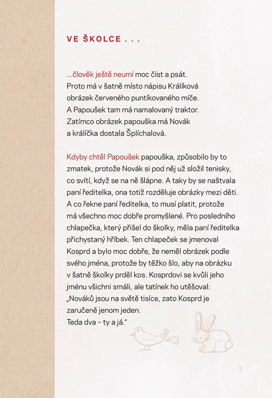 Příběh ze školky zachycuje každodenní momenty, které se mohly přihodit v kterékoliv mateřské školce, stejně jako vypovídá o dětské fantazii i nápadech předškoláků, nad nimiž se dospělí nestačí divit. Přátelství Kosprda a Telecí i jejich dobrodružství a postoje jsou zachyceny velmi vtipně a současně velmi pravdivě.