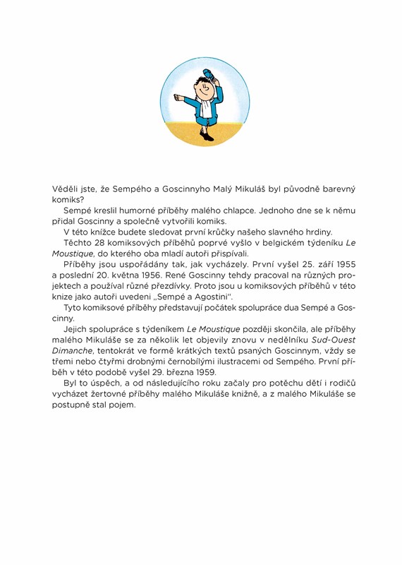 Věděli jste, že příběhy malého Mikuláše vznikly původně jako komiks? Dosud knižně nikdy nevydané příběhy spatřily světlo světa v roce 1955 a s nimi i postavička malého Mikuláše. Vycházely na pokračování v belgickém týdeníku Le Moustique. Později se je Sempé a Goscinny rozhodli oživit v novinách Sud Ouest, tentokrát už ale ve formě krátkých ilustrovaných příběhů, které všichni známe a milujeme dodnes.