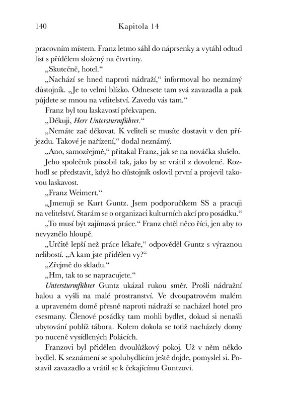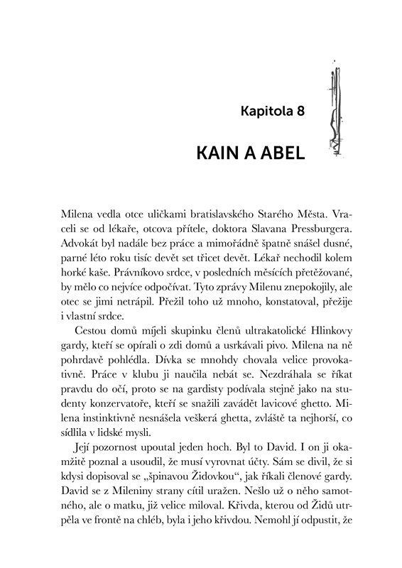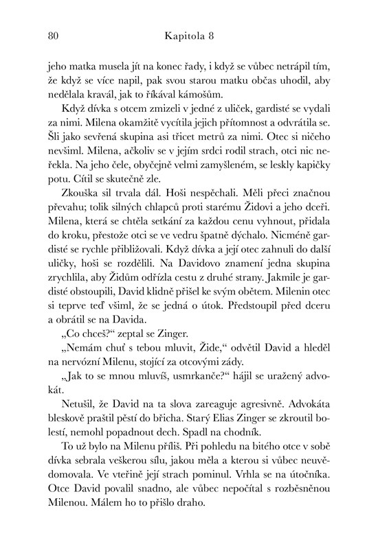 Mladý Němec vytáhl z pouzdra Parabellu, nabil a bezmyšlenkovitě lékaře střelil do hlavy. Pressburger padl mrtvý k zemi. Dívka ucítila zápach krve. Tehdy pohlédla na Němce, doktorova vraha. Byl velmi mladý. Nemohl mít víc než dvacet let, možná dvacet dva. Pomyslela si, že je to její vrstevník. Schoval pistoli do pouzdra. I mladý Němec na ni pohlédl. Jejich pohledy se nad mrtvolou lékaře setkaly. Milena vycítila, že má před sebou naprosto lhostejného a bezohledného muže, který by ji zabil stejně chladnokrevně jako starého Pressburgera.