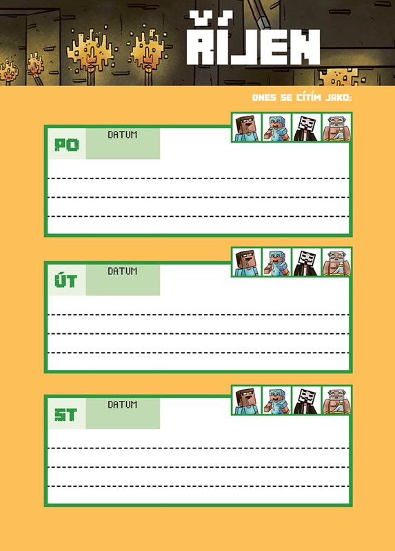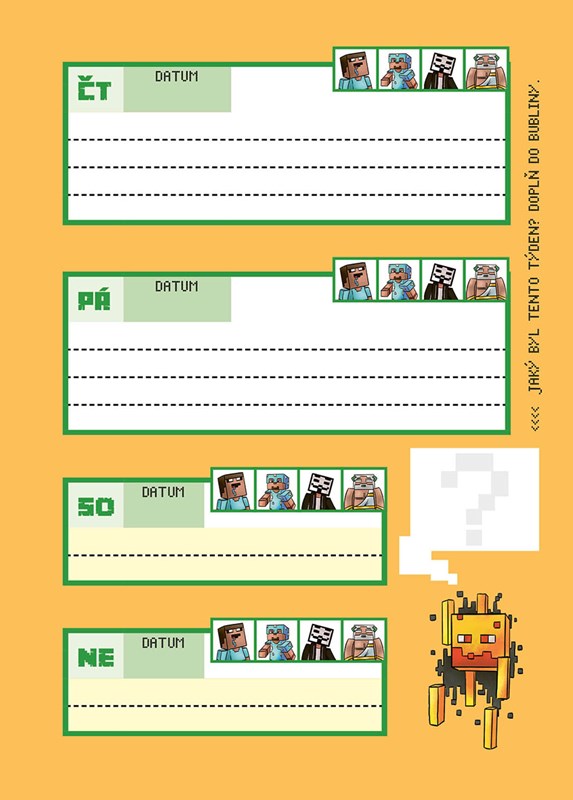 Najdeš v něm nejen praktický týdenní diář na jakýkoliv školní rok, praktický rozvrh hodin a barevný roční plánovač, ale především spoustu svých oblíbených skinů, monster a zvířat, kteří trousí vtipné hlášky a v záloze pro tebe mají hromadu užitečných taháků z češtiny i matematiky!
