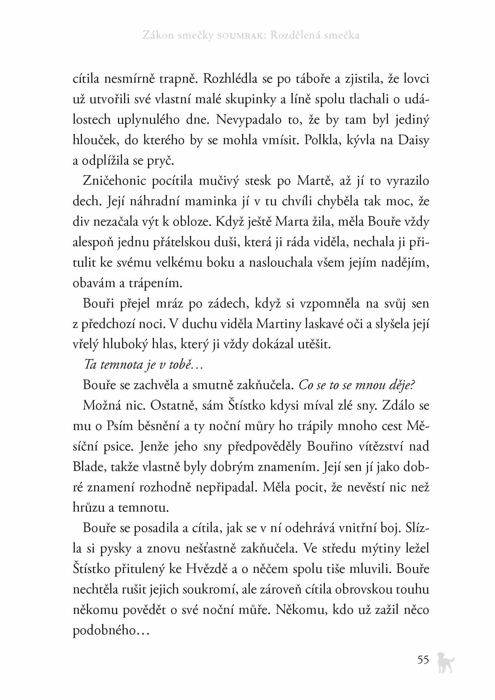 Mladá fenka Bouře celý svůj život usilovala o řádné místo v divoké smečce. Nyní se konečně cítí přijata, ale napětí v tlupě znovu stoupá. Někteří psi nejsou spokojeni s novou hierarchií a jiní stále nedůvěřují Bouři a Šípovi, kteří patří k rase hlídacích psů. Nebezpečí tentokrát číhá uvnitř smečky…