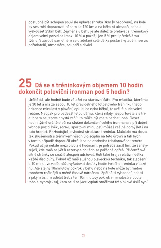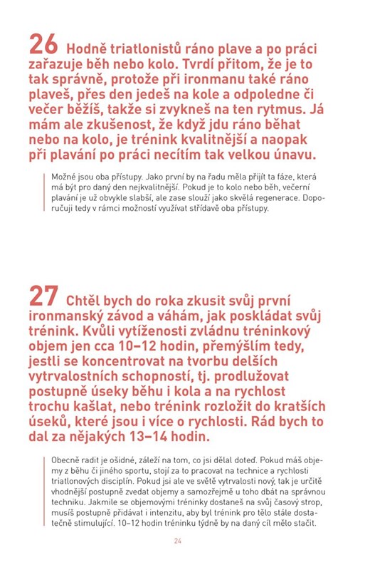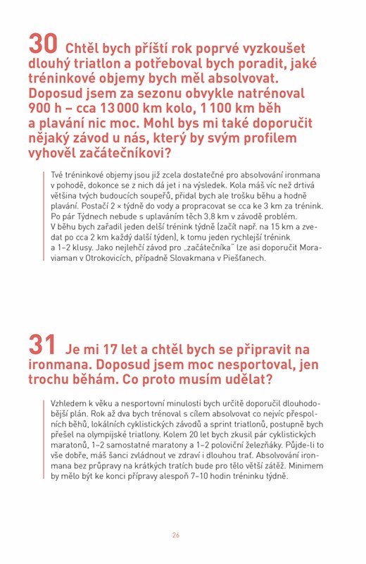 226 – to je součet kilometrů, který musí zdolat každý účastník dlouhého triatlonu, tedy ironmanu. A stejný počet otázek na všechna úskalí sportu tvořeného plaváním, cyklistikou a během najdete v této jedinečné publikaci. Na všechny odpovídá Petr Vabroušek, přední triatlonista se stovkami dlouhých triatlonů i dalších extrémních závodů na kontě. Metodika tréninku, vybavení, stravování, mentální příprava i samotné závodění – to vše vás čeká v jediné příručce, kterou pro úspěšné zvládnutí triatlonu potřebujete.