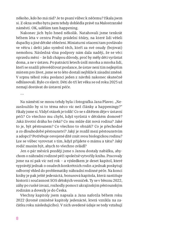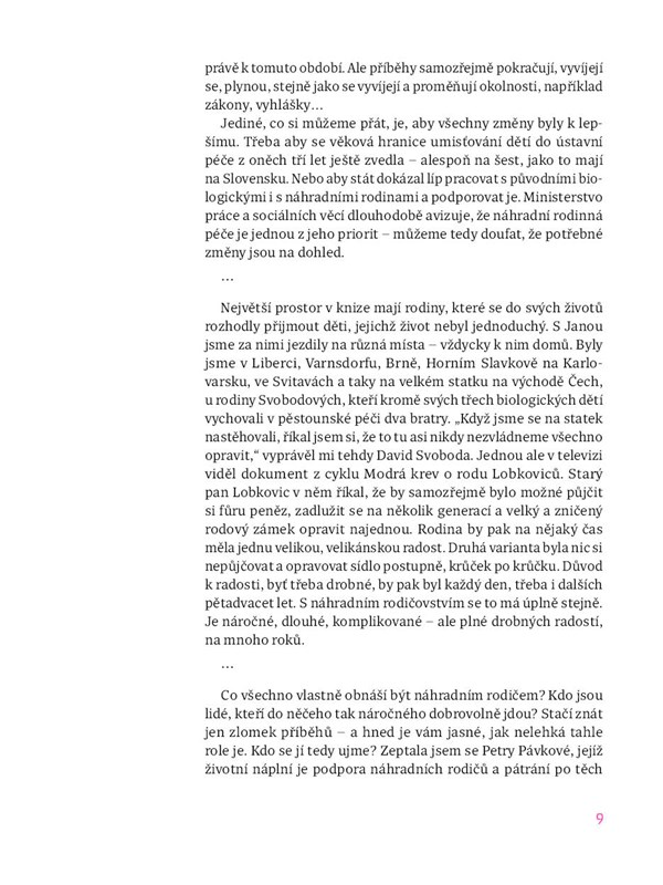 Novinářka Barbora Postránecká a fotografka Jana Plavec zachycují příběhy těch, kterým osud nadělil těžký začátek života. Jaké to je být pěstoun? Co všechno to obnáší? Jaký je rozdíl mezi pěstounstvím a adopcí? Proč potřebuje dítě znát svoji biologickou rodinu? Jak se vyrovnat s tím, když přijdete o mámu a tátu? Jaké to je, vyrůstat v dětském domově? Jaké to je, najít nový domov? A jaký rodič musím být, abych to celé zvládl? Kniha není ale jen pro ty, kteří o náhradním rodičovství uvažují. Je i pro všechny ty, kteří rádi čtou skutečné příběhy, které mnohdy nemají daleko k románovým zápletkám. A vlastně může být pro každého, kdo chce nahlédnout, jaké křehké může dětství být a jak moc záleží na tom, abyste v něm měli někoho blízkého.