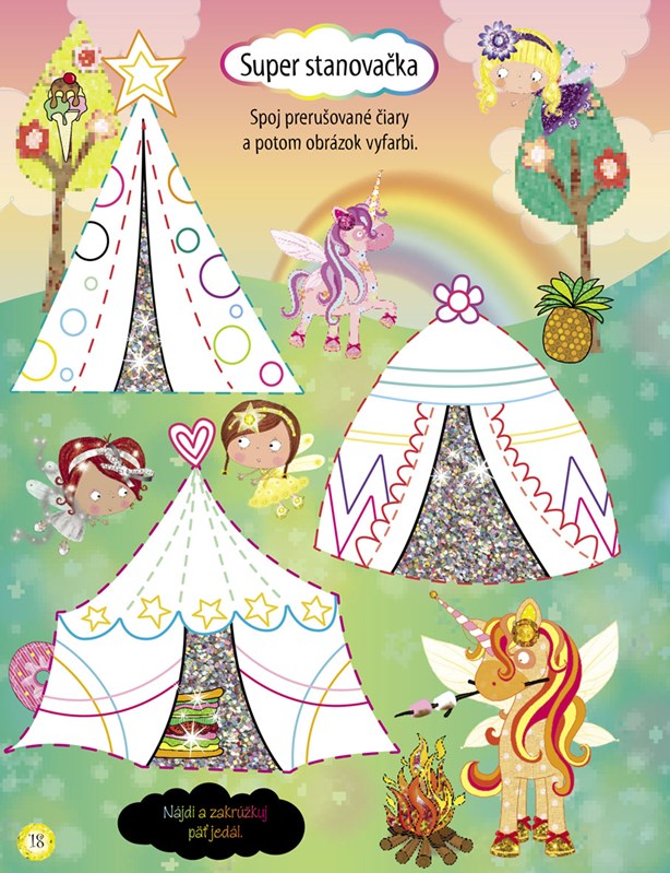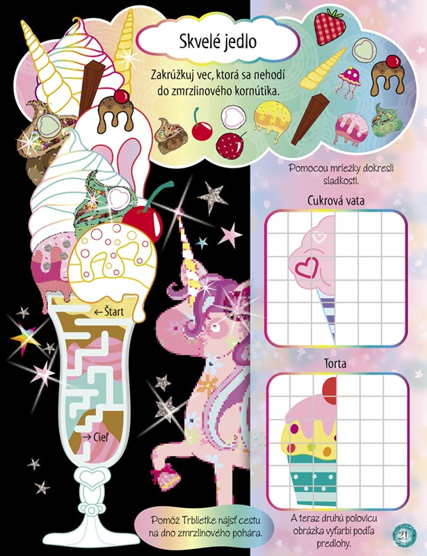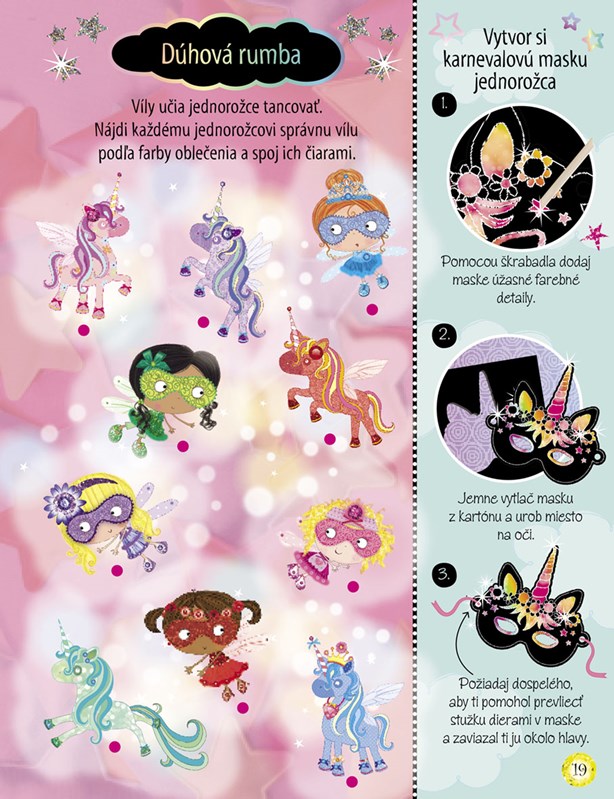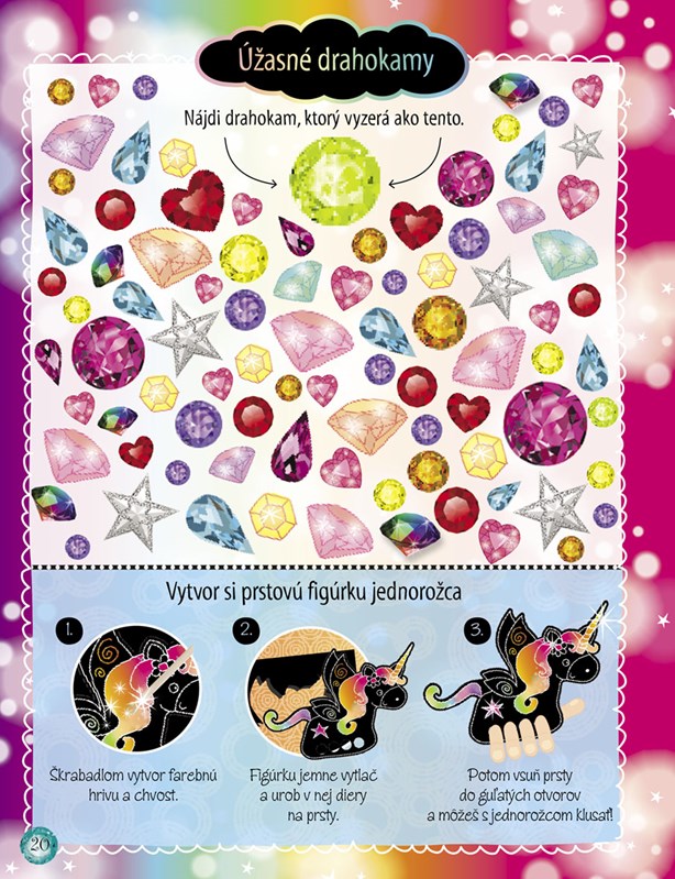 Čaká na teba veľa úžasných aktivít a navyše zoškrabovacie strany ukrývajúce nejedno trblietavé prekvapenie. Odhaľ ich a vyrob si jagavý roh jednorožca, čarovnú paličku, nádherný náhrdelník a mnoho ďalších očarujúcich doplnkov a ozdôb.