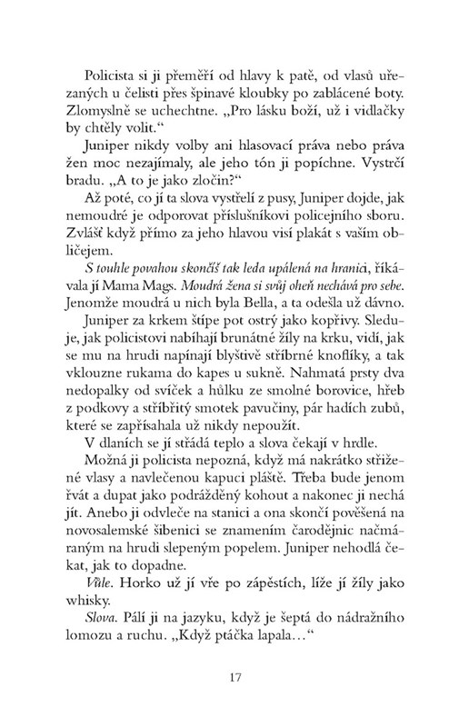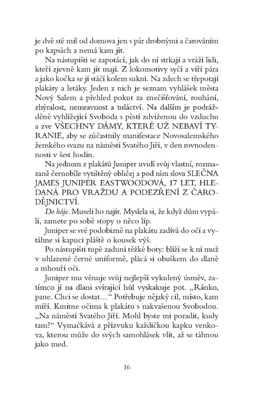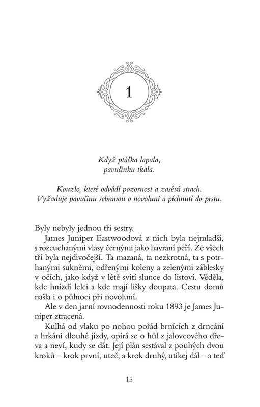 V roce 1893 nic jako čarodějnice neexistuje. Kdysi na světě žily, v těch divokých, temných dnech před tím, než se začalo s upalováním, ale dnes se čarodějnictví omezuje na talismany pro štěstí a dětské říkanky. Pokud touží moderní žena po jakékoli špetce moci, nechť ji hledá u volební urny a hlasovacích lístků.