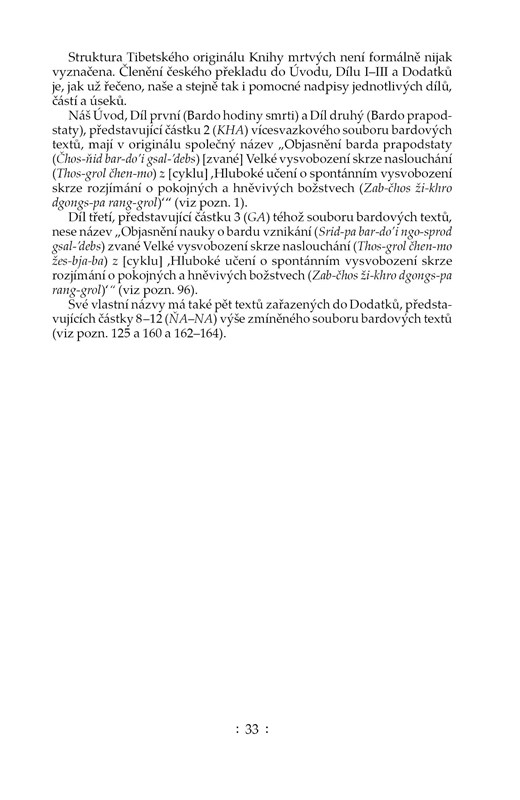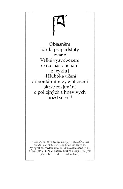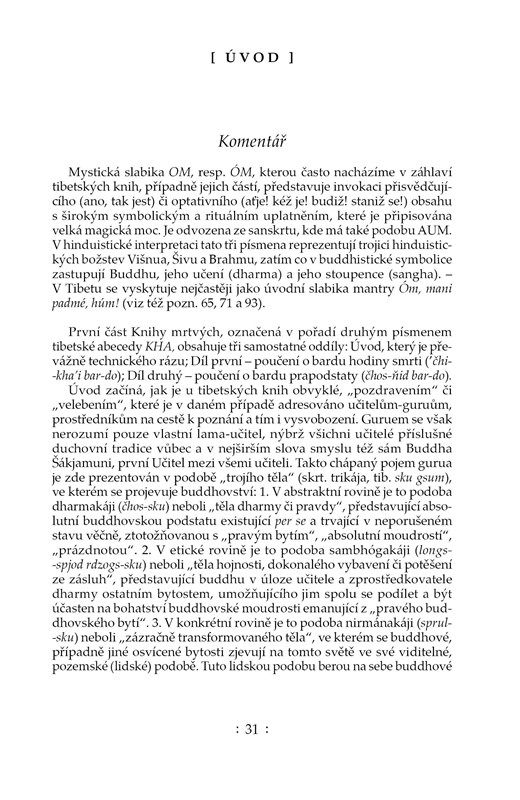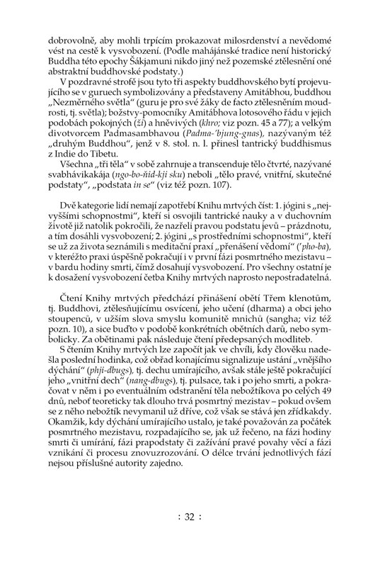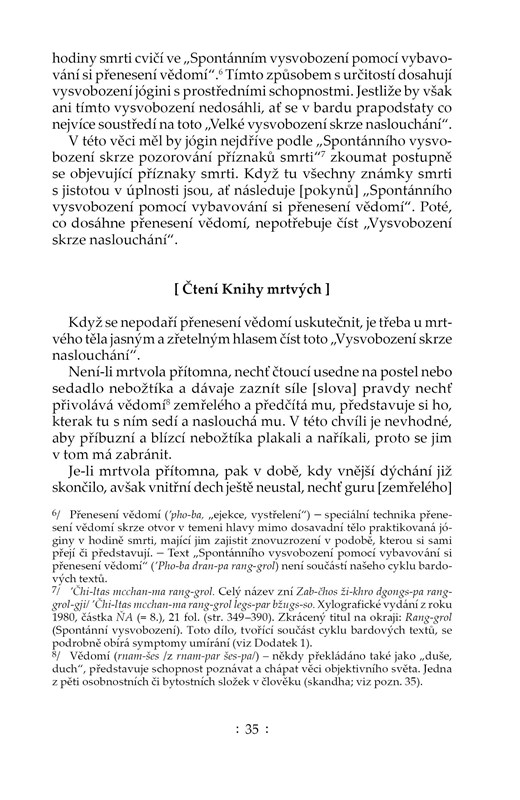 Základní dílo tibetského buddhismu, zejména buddhistické morálky a filosofie. Jeho vznik se datuje do 8. století n. l., kdy byla Kniha mrtvých patrně poprvé zapsána, avšak v následujících zhruba šesti stoletích patřila k tajným, „zakopaným“ knihám, které nepronikly na veřejnost. Kniha mrtvých je formulována jako poučení zemřelému na jeho cestě do „zásvětí“ – v „mezistavu“, který následuje po fyzické smrti. Poučení člověku na přechodu mezi těmito dvěma stavy pak není jen popisem pohřebního rituálu, nýbrž také, a vlastně především, plánem správné životní cesty, vedoucí k vysvobození. Pro Evropany je ojedinělým kulturněhistorickým svědectvím o myšlení a způsobu život ve starém Tibetu.