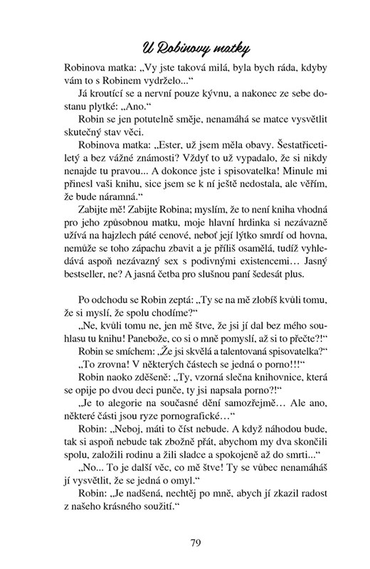 Ester na svém blogu vtipně glosuje svůj život single třicítky. Doufá, že si její články jednou přečte její psychoterapeut, do kterého je tajně zamilovaná. Je cit k němu skutečný, nebo se jedná o pouhé platonické pobláznění? Romantický román s notnou dávkou sebeironie vypráví o hledání lásky i sebe sama.