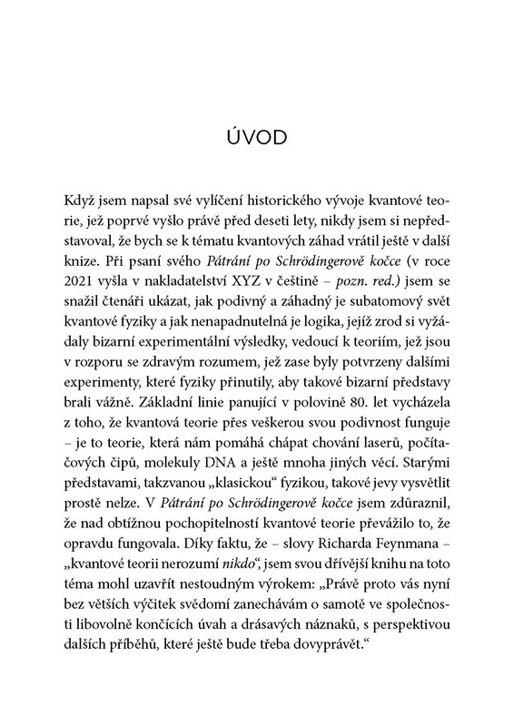 Gribbin se však nezastavuje pouze u teorie. Vede čtenáře na cestu historií kvantové fyziky, představuje klíčové vědce, jako byli Albert Einstein, Erwin Schrödinger, Werner Heisenberg nebo Hugh Everett, a rozebírá jejich přínos i vzájemné spory. Kniha zároveň zkoumá filozofické otázky, které kvantová fyzika přináší – například zda může být realita objektivní, nebo zda naše pozorování ovlivňuje samotnou podstatu vesmíru.
