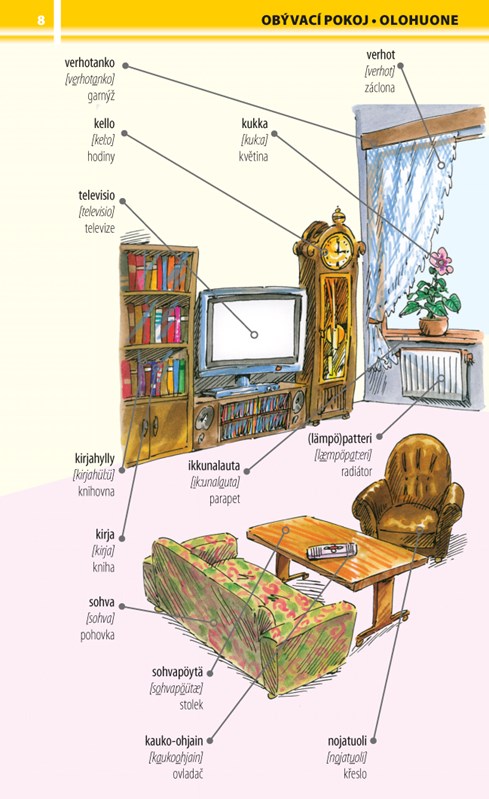 Knížka se stane dobrým pomocníkem při učení a procvičování finských slovíček. Na veselých obrázcích, jež znázorňují běžné životní situace, najdete názvy věcí, se kterými se denně setkáváte. Týkají se cestování, zábavy, vybavení bytu, školy, sportu ad. Každý tematický celek je pak doplněn jednoduchými frázemi ze života. Na konci se nachází souhrnný česko-finský slovník obsahující veškerá slova ilustrované části.