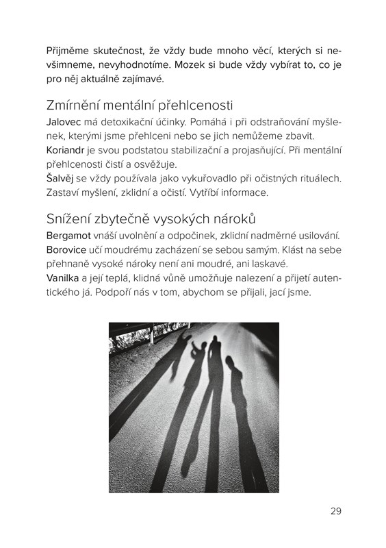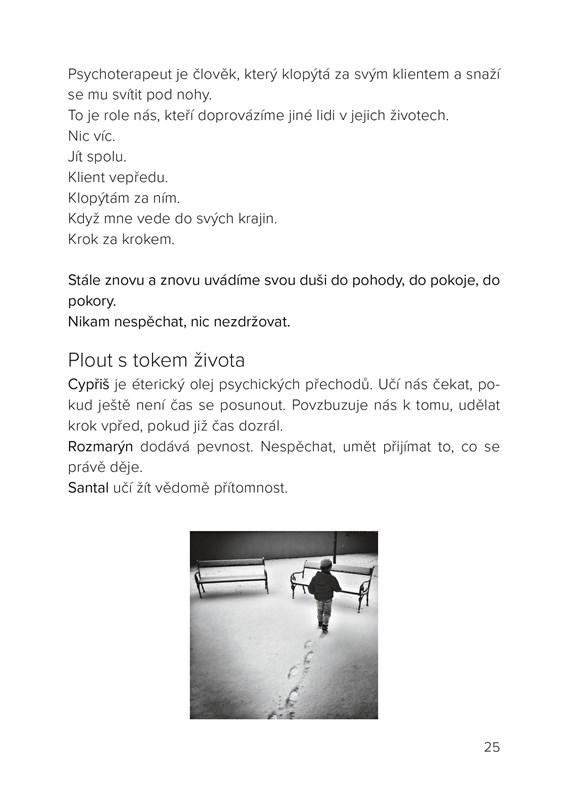 Přírodní vůně ovlivňovaly lidskou psychiku již od pradávna. Autorka Barbora Krejčí, psychoterapeutka a aromaterapeutka, propojila své zkušenosti z obou těchto oborů a ve své knize ukazuje, jak nás aromaterapie může provázet každodenností, jak může podporovat psychickou pohodu, usnadňovat řešení problémů a být pomocníkem v osobním rozvoji. Sdílí své úvahy nad životem a o něm, nabízí nám nový pohled na řešení některých situací a jejich podporu éterickými oleji.