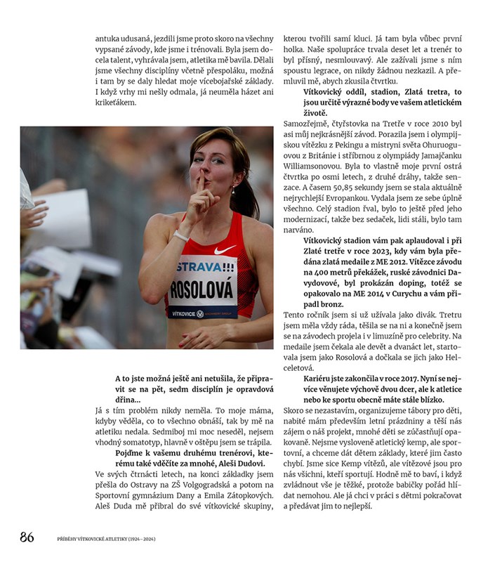 Vtip i nadhled, dojetí i úctu přináší vyprávění osobností spjatých s vítkovickou atletikou. Je to unikátní mozaika vzpomínek lidí, kteří psali historii královny sportu v Ostravě, v Česku a bez nadsázky i ve světě. V kapitolách, které tvoří spíše tematické celky než nějaký chronologický výčet historických událostí, se čtenář formou rozhovorů nebo vyprávění dotkne nejniternějších pocitů a zážitků žen a mužů, kteří stáli v pozadí každodenní práce, i legend československé, české i světové atletiky. Podívá se na svět na dráze a kolem ní očima sportovců, trenérů, lidí z managementu, slavných komentátorů, lékařů, mecenášů a dalších. Dojme se nebo zasměje s olympioniky jako Helena Fibingerová, Taťána Netoličková, Denisa Rosolová, Jaroslav Bába. Nebude připraven ani o historky Jana Železného, který zůstává Vítkovicím věrný do současnosti jako ředitel Zlaté tretry. Nahlédne pod pokličku organizace velkých světových akcí. Z příběhů Ireny Szewińské, Sergeje Bubky, Usaina Bolta, Alberta Juantoreny, lorda Sebastiana Coea, Monda Duplantise a dalších úžasných světových atletických hvězd, které se na vítkovický stadion opakovaně vracely a vrací, pocítí to jedinečné kouzlo, které vznikne jen tehdy, když lidé s dobrou vůlí dají k dispozici svůj um, nadšení a odhodlání a vytvoří jedinečné podmínky a atmosféru – tak jako ve Vítkovicích. A právě jim je tato kniha poctou. Není v silách autorů připomenout na dvou stovkách stran všechny ty, kteří se stali součástí onoho impozantního obrazu. Dílo je tak především jakousi esencí příběhu, který má být impulsem, aby se na to krásné a důležité nezapomínalo.