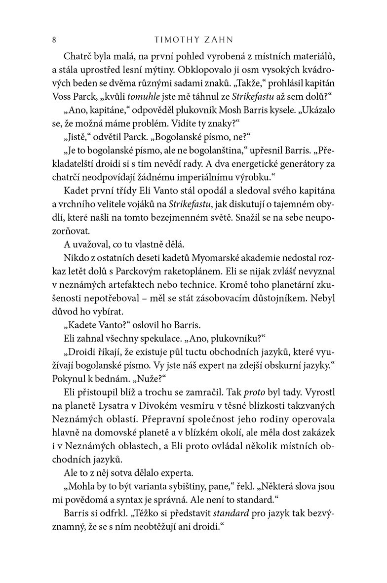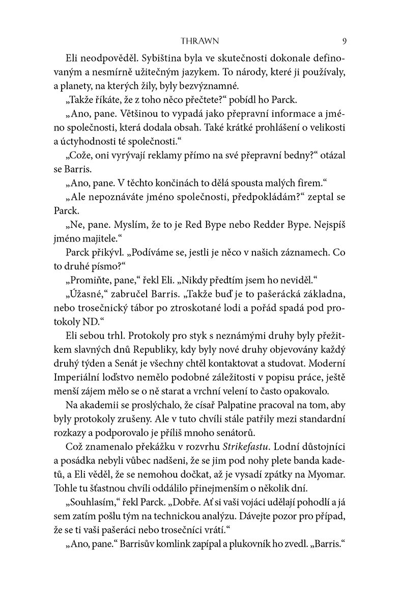 Velkoadmirál Thrawn, jeden z nejschopnějších a nejnelítostnějších válečníků v dějinách Galaktického impéria, je také jednou z nejpodmanivějších postav v univerzu Star Wars. Od svého uvedení v románu autora Timothyho Zahna Dědic Impéria a přes svá další dobrodružství v románech Temná síla na vzestupu, Poslední rozkaz a dalších si velkoadmirál Thrawn získal mezi největšími padouchy Star Wars ikonické postavení. Ale jeho původ a příběh jeho postupu v imperiálních řadách zůstávaly zahalené tajemstvím. Nyní Timothy Zahn v knize Thrawn odhaluje osudové události, které brilantního vojenského stratéga a smrtícího vojevůdce s modrou kůží a rudýma očima dostaly do nejvyšších mocenských kruhů – a do nelibosti.